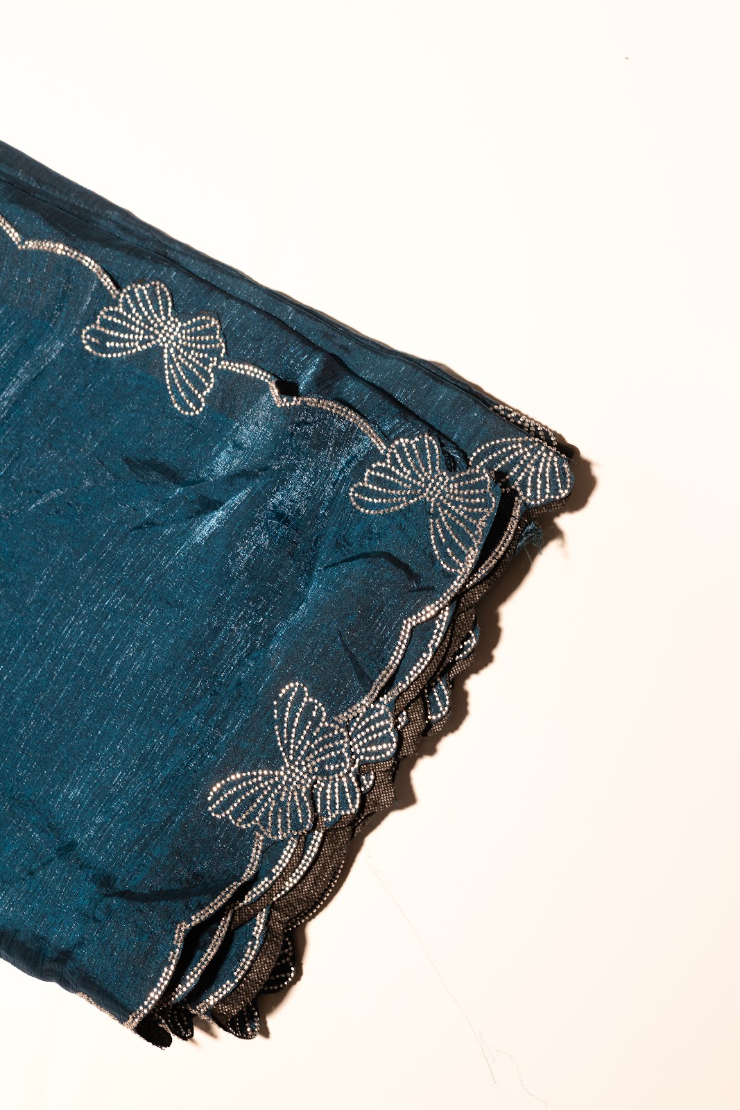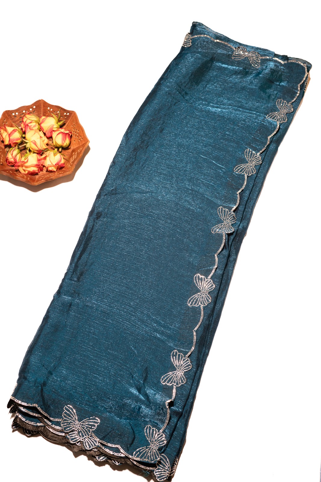 Peacock blue crushed tissue saree featuring butterfly stone detailing along the border. Lightweight with a natural crinkled texture, finished with a scalloped, stone-embellished edge for an elegant festive drape.