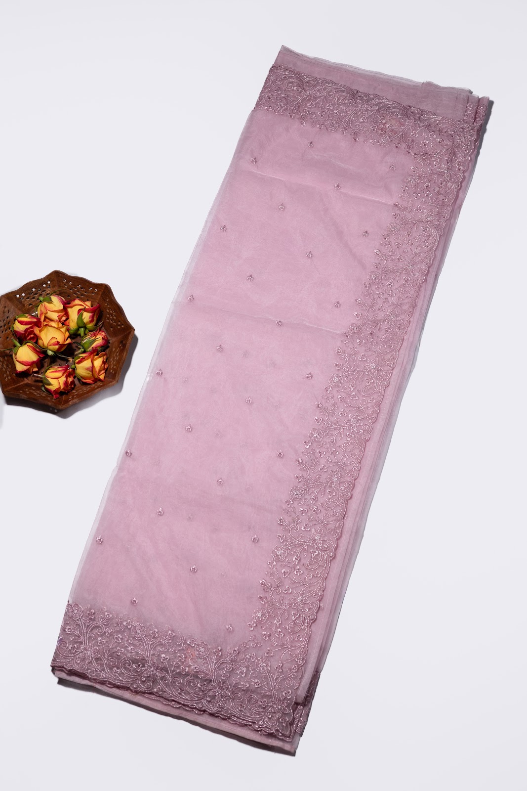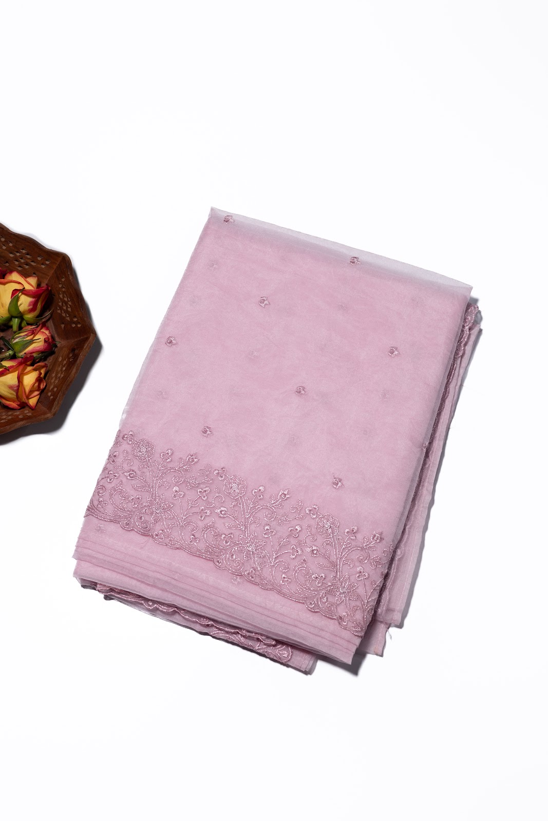 Soft organza saree featuring delicate floral threadwork scattered across the body. Highlighted by a richly embroidered C-pallu with intricate floral detailing. Paired with a plain matching blouse finished with the same border. Sheer, lightweight, and effortlessly elegant. Available in Powder Pink colour.