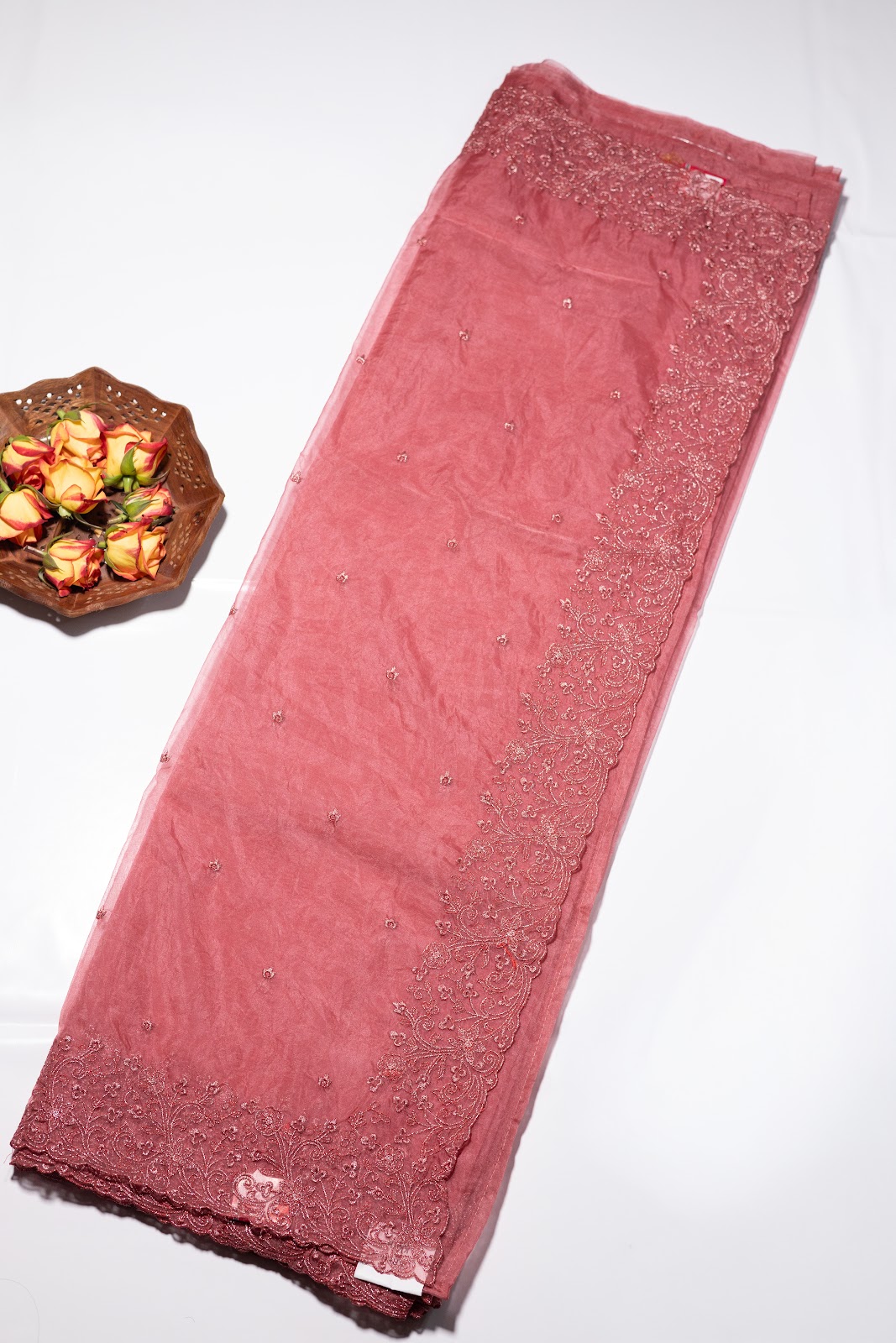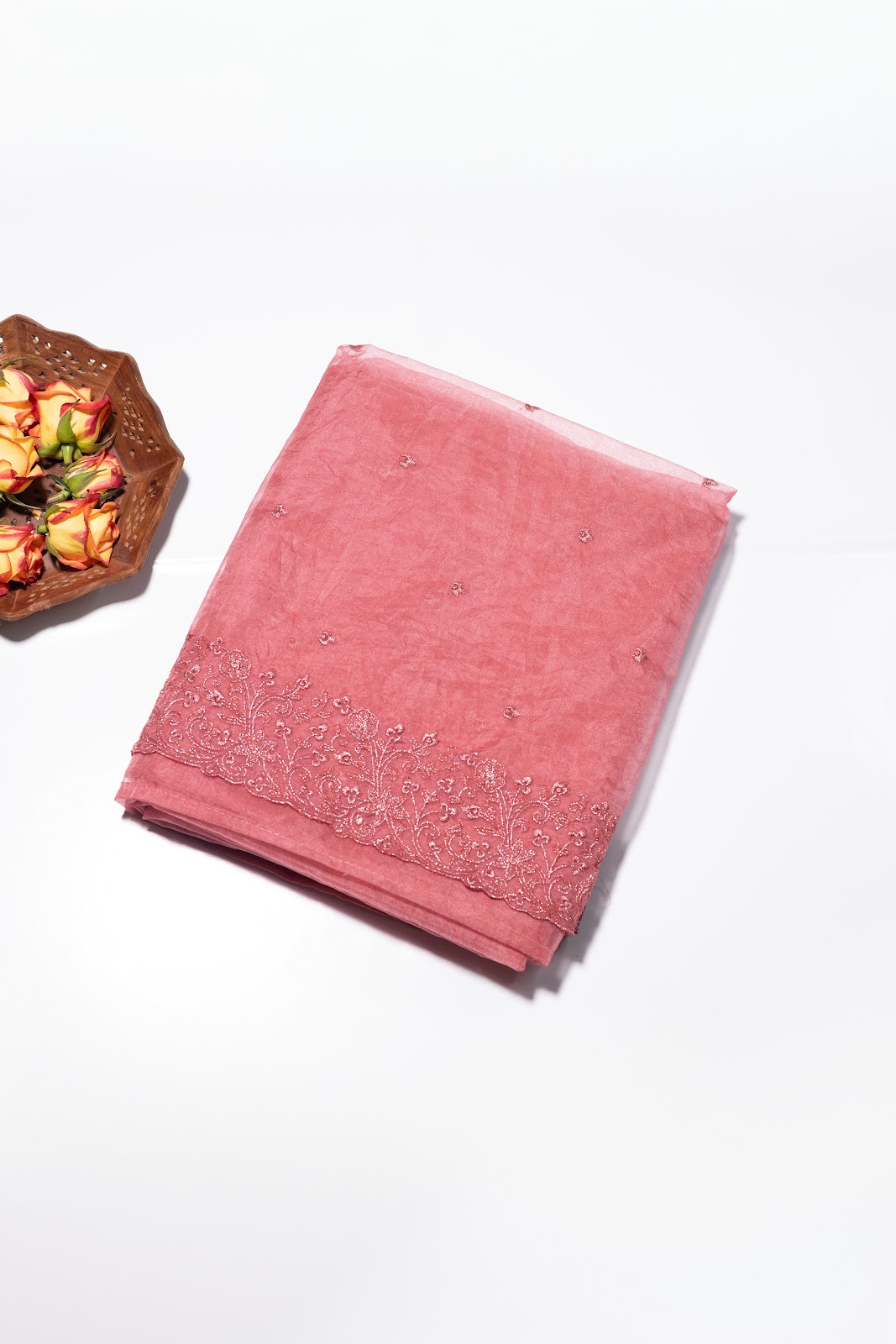 Soft organza saree featuring delicate floral threadwork scattered across the body. Highlighted by a richly embroidered C-pallu with intricate floral detailing. Paired with a plain matching blouse finished with the same border. Sheer, lightweight, and effortlessly elegant. Available in Onion Pink colour.