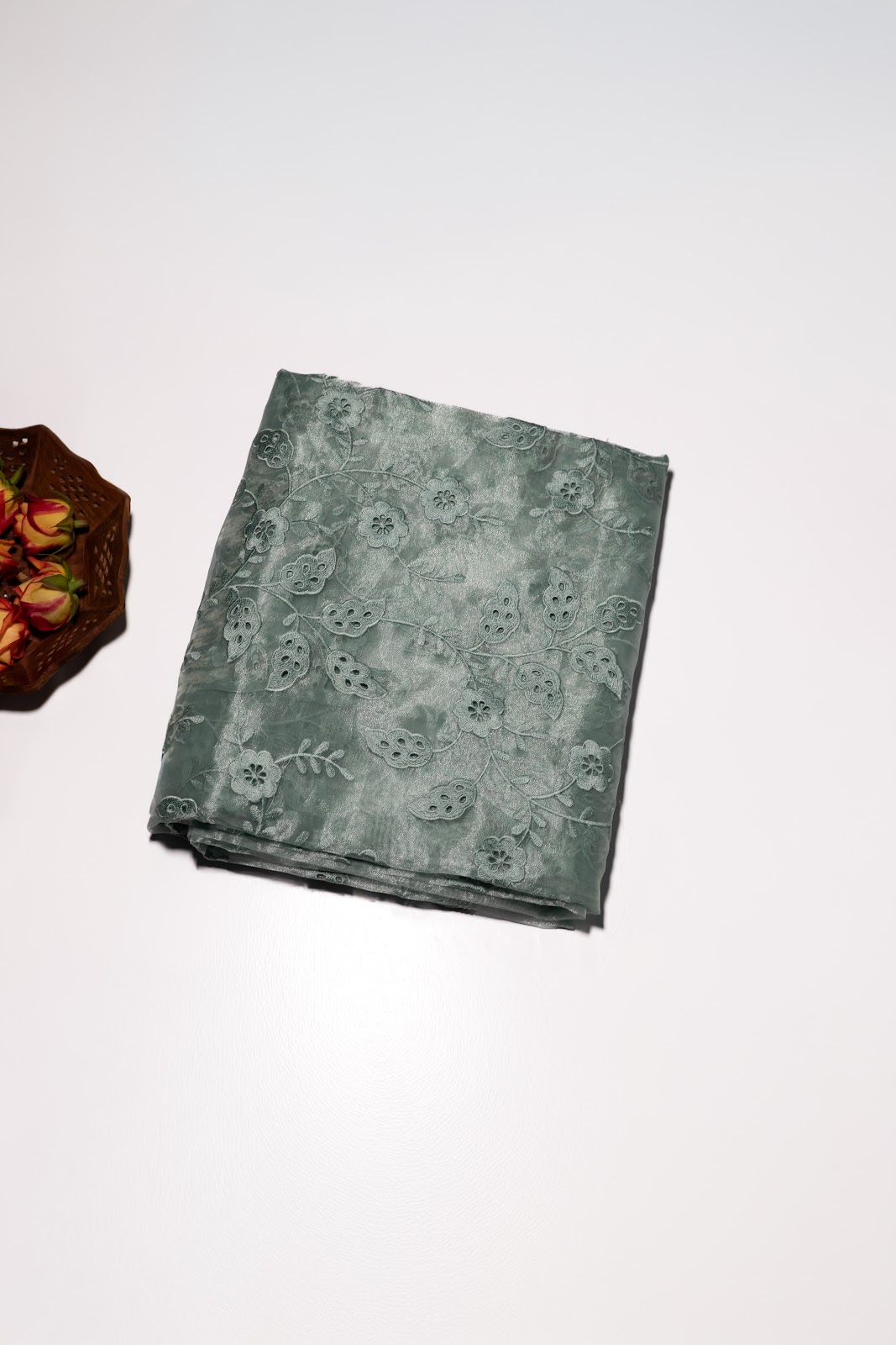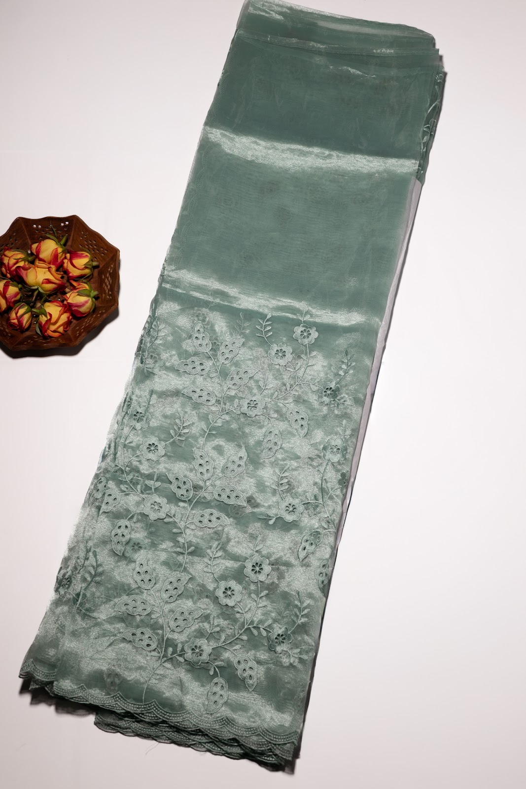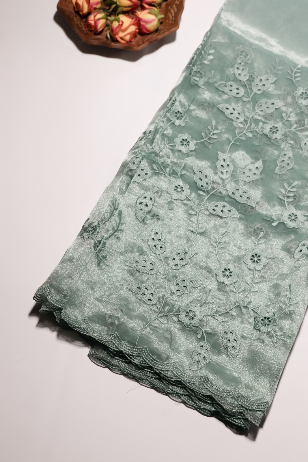 Shimmer Organza Cutwork Saree Set featuring delicate floral cutwork embroidery and elegant scalloped borders. Lightweight with a soft sheen, these sarees drape beautifully and are perfect for any occasion. Available in Aqua Blue.