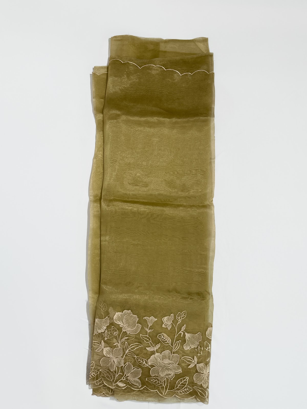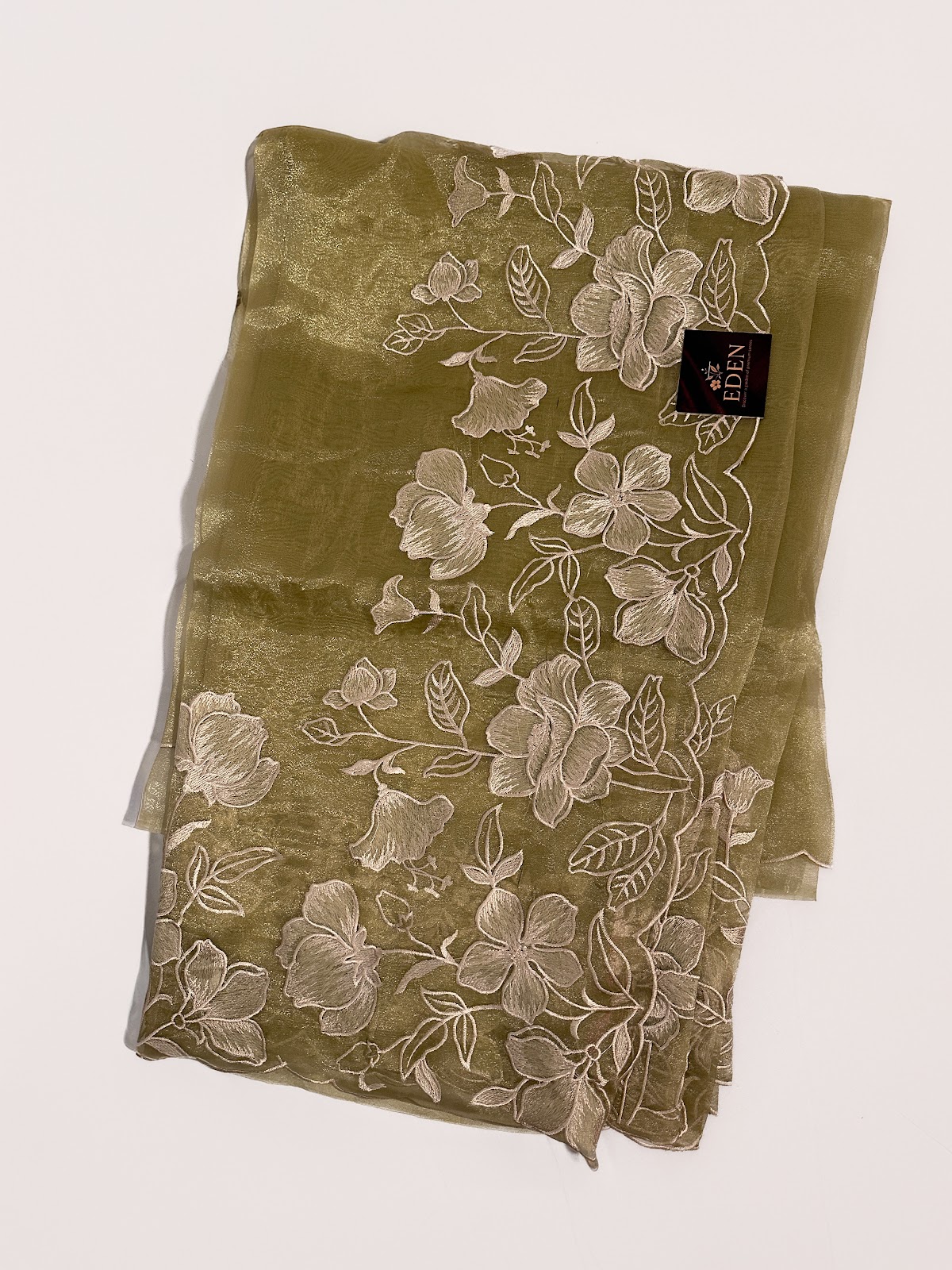 A dreamy organza saree adorned with delicate beige floral threadwork, finished with elegant beige scalloped edges. Light and sheer, this statement piece brings soft romance and a perfect blend of modern charm. Available in olive green.