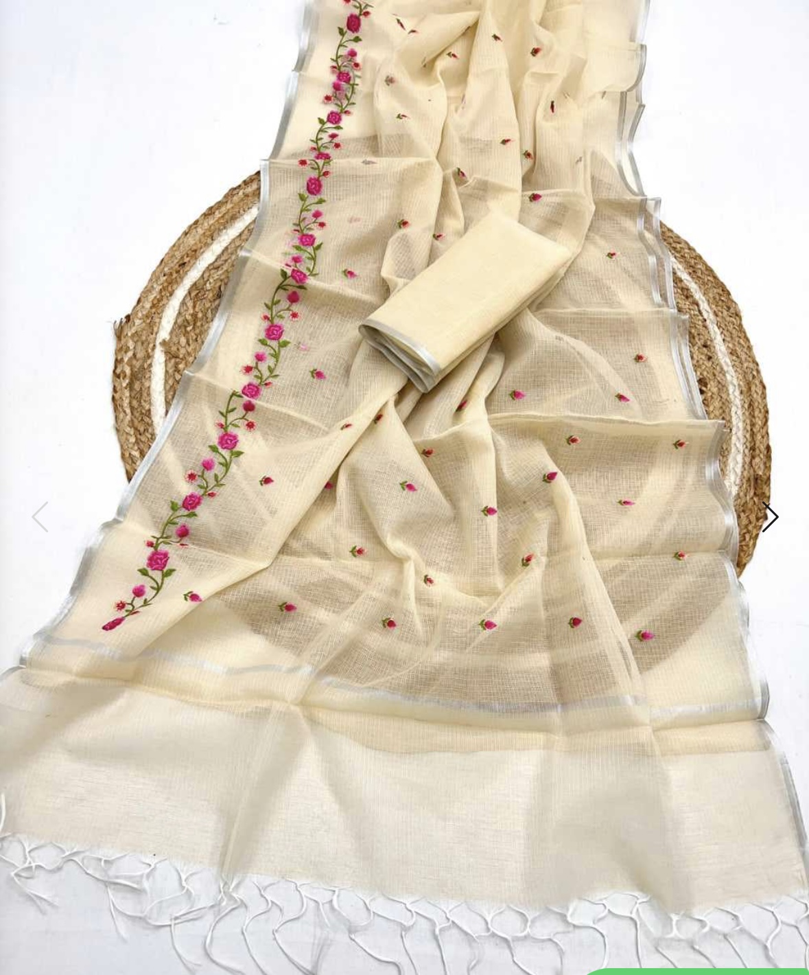 Pure net kotta saree with small silver border embellished with floral embroidery work and hand made tassels at pallu, comes with a running blouse. Available in Beige.