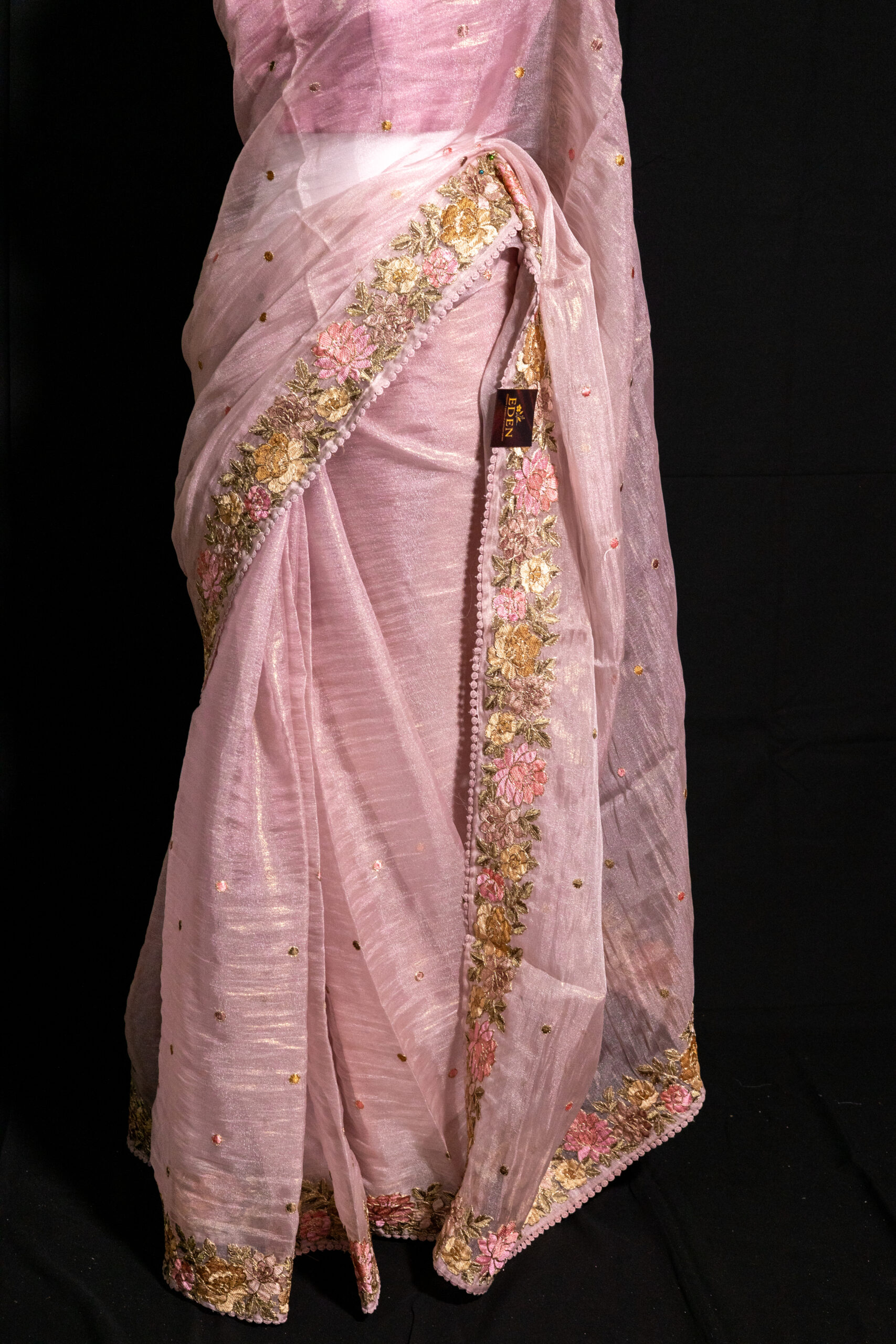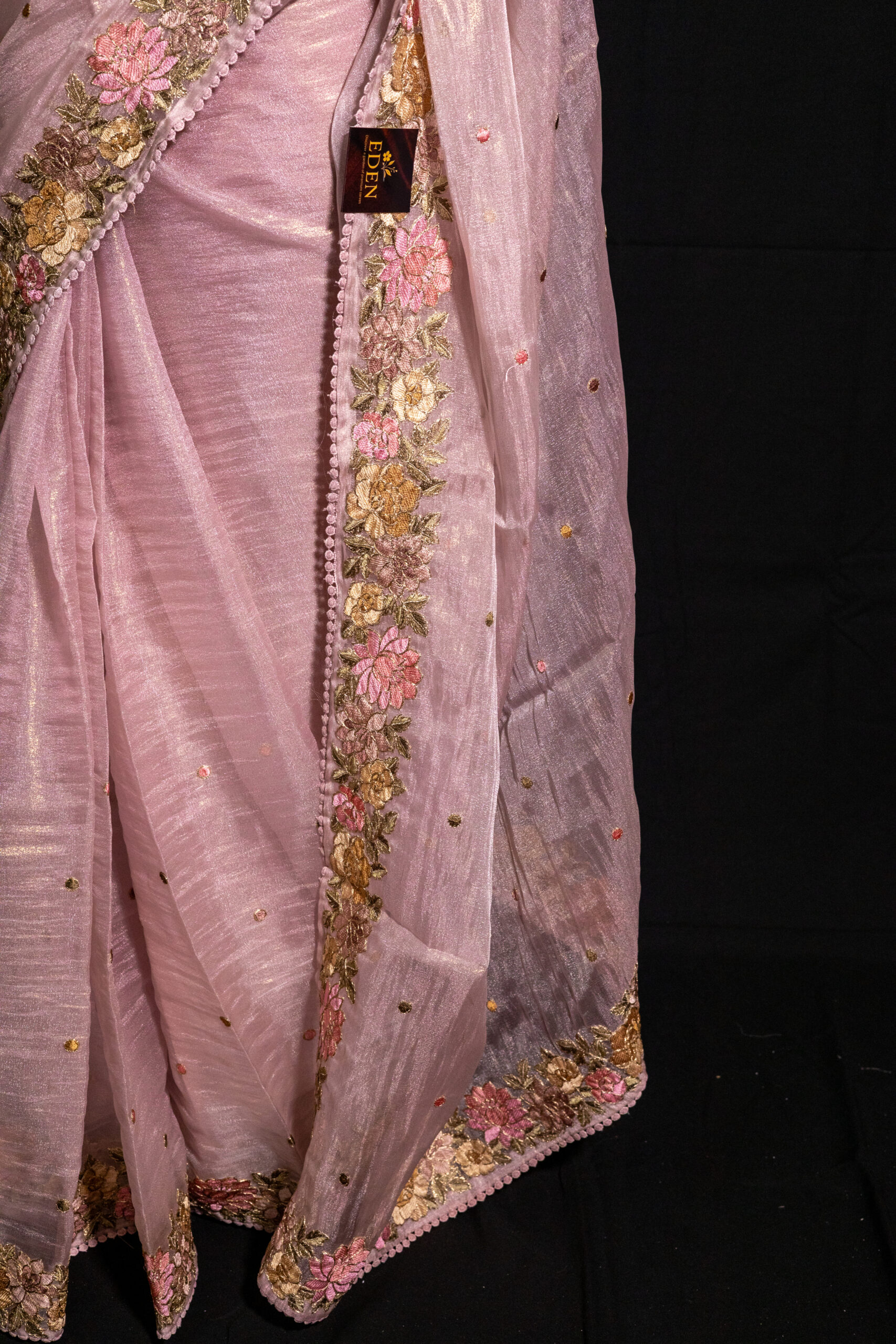 Crushed tissue organza saree in baby pink tone, adorned with delicate multicolour butta detailing scattered across the body. Finished with graceful floral threadwork embroidery running along both borders and edged with a soft lace finish.