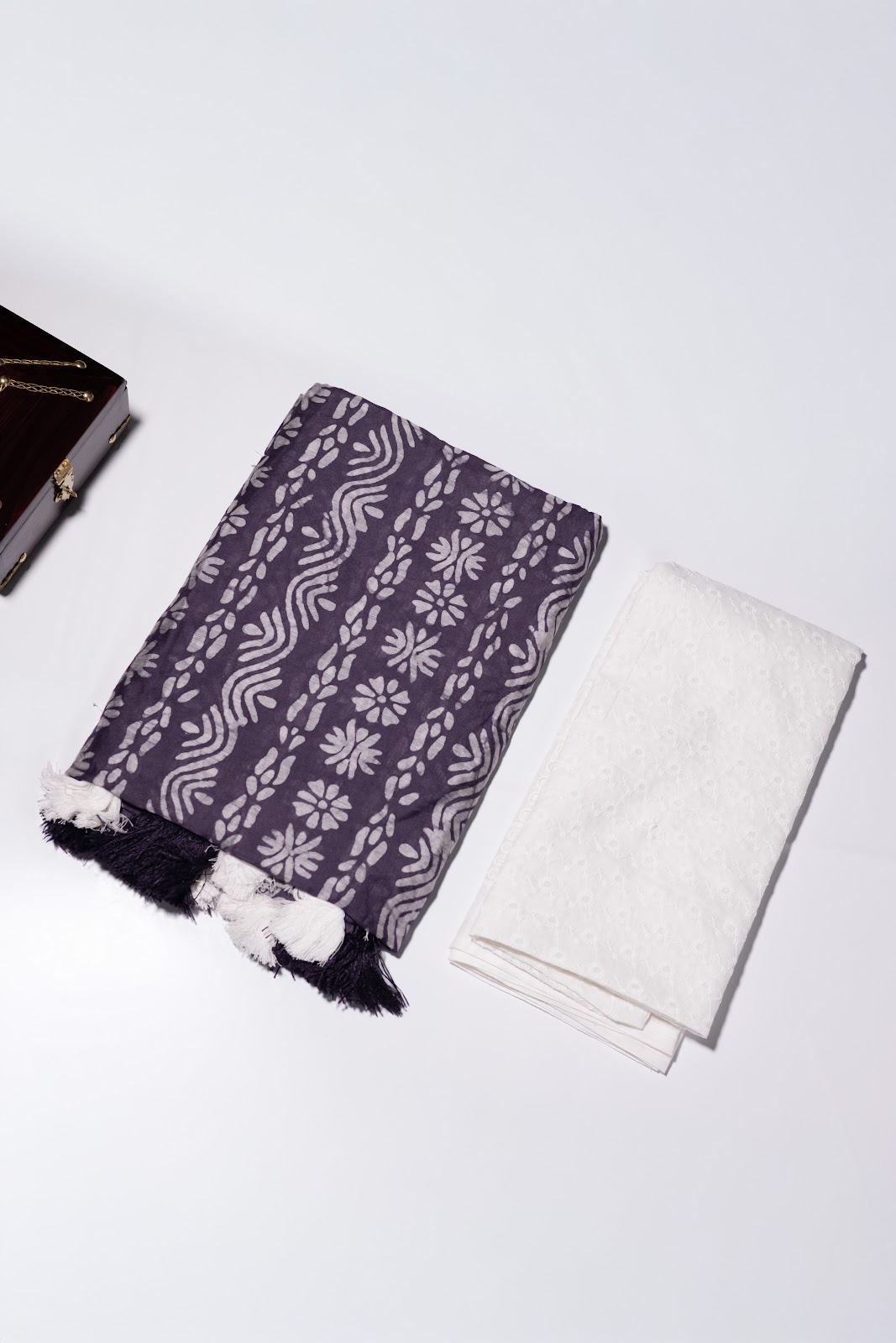 Soft pure chanderi cotton saree with allover batik prints. Cotton tassles on pallu. Blouse- white cotton luckonowi style emboridary blouse. Available in Lavender.