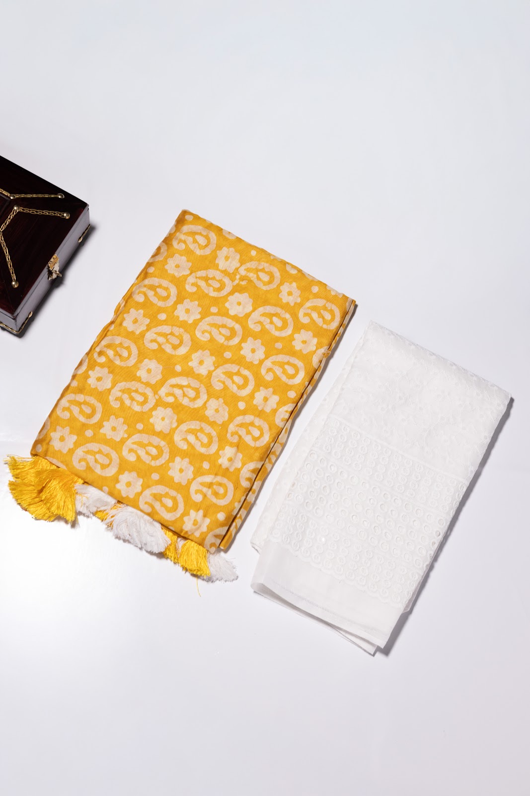 Soft pure chanderi cotton saree with allover batik prints. Cotton tassles on pallu. Blouse- white cotton luckonowi style emboridary blouse. Available in Yellow.