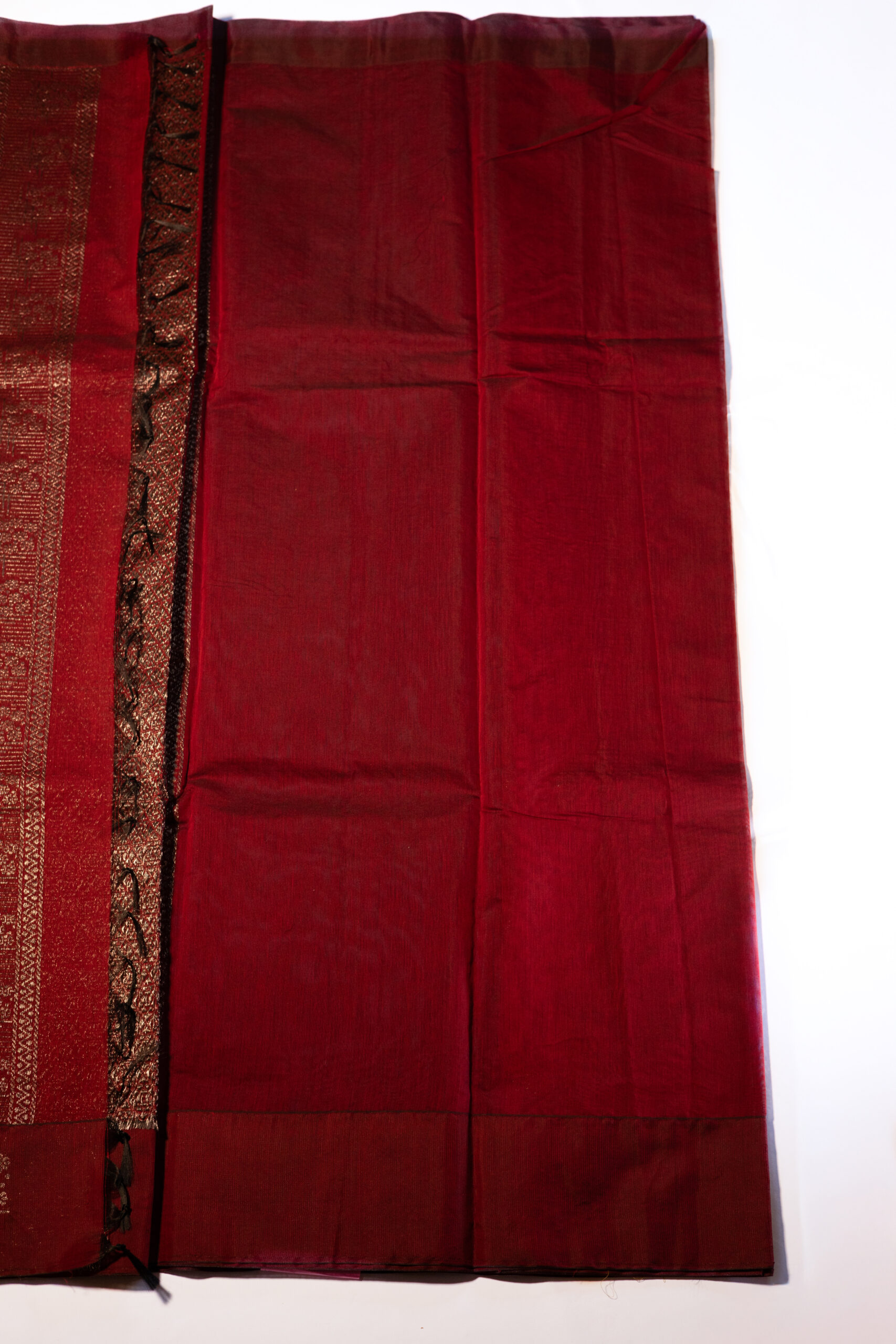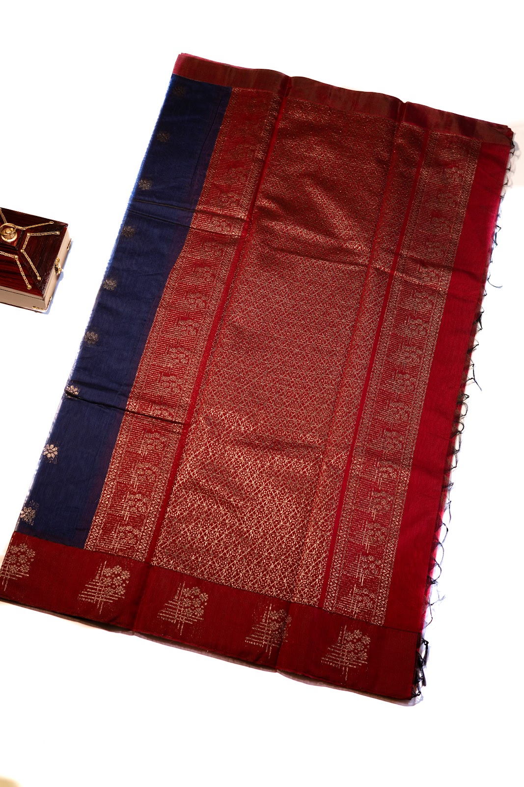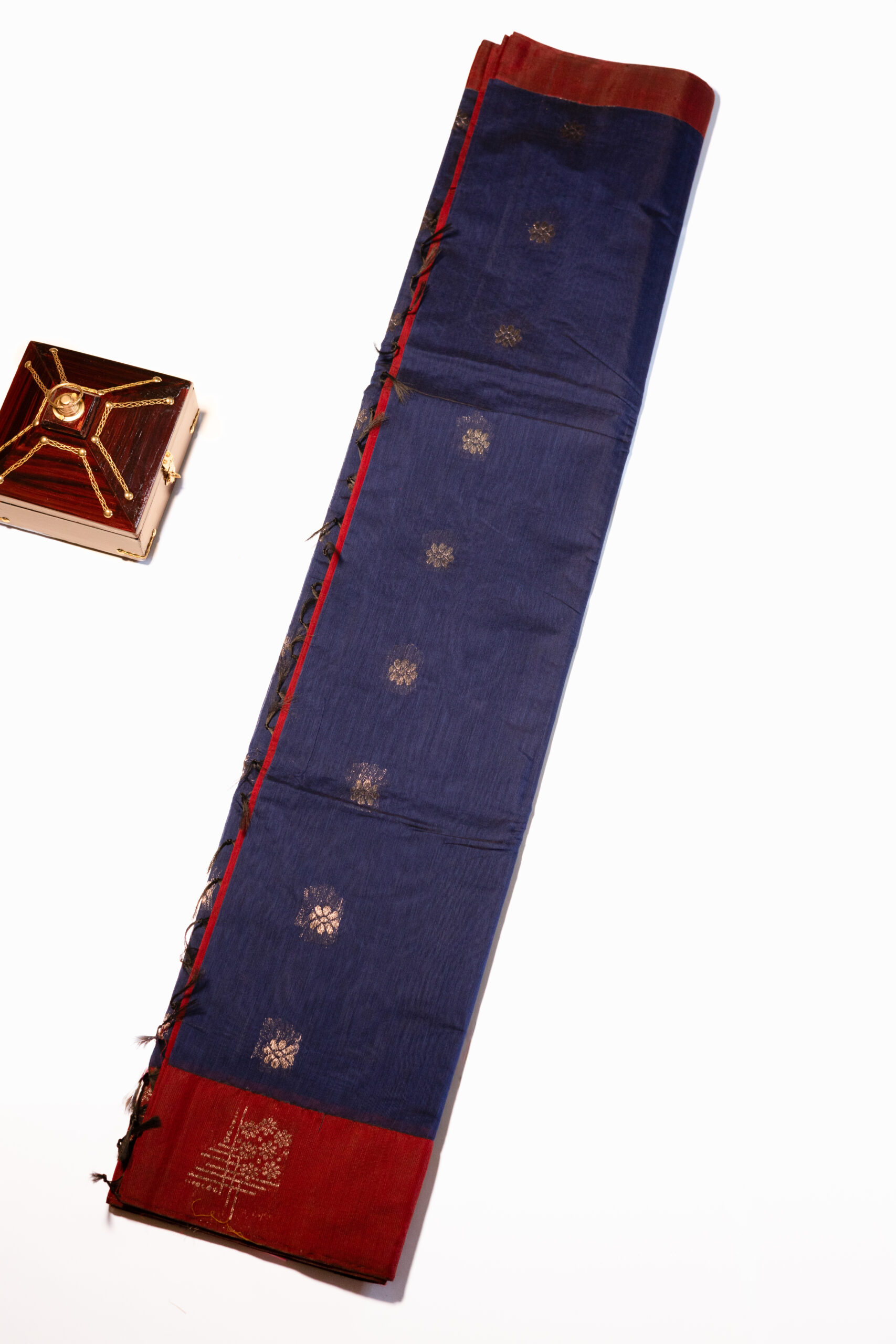 Cotton silk saree featuring a rich dark blue body accented with subtle silver metallic zari motifs. Finished with a striking maroon border and paired with a matching maroon blouse for a refined contrast.