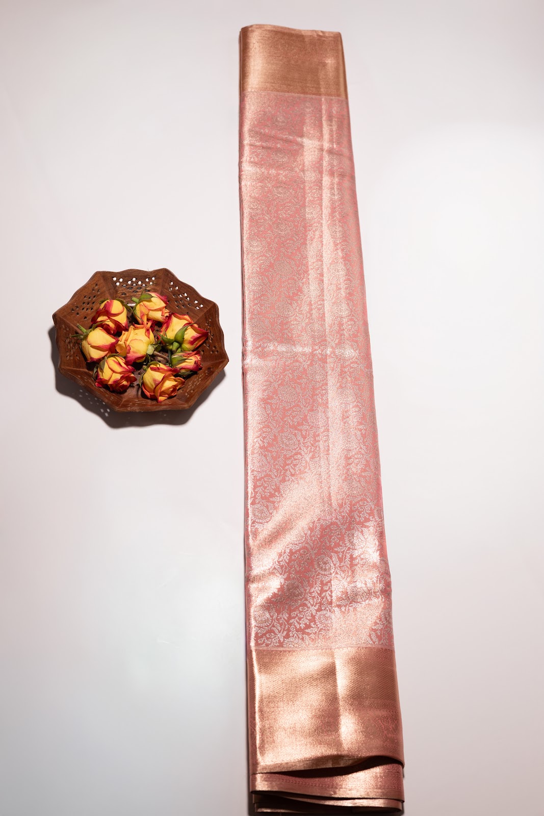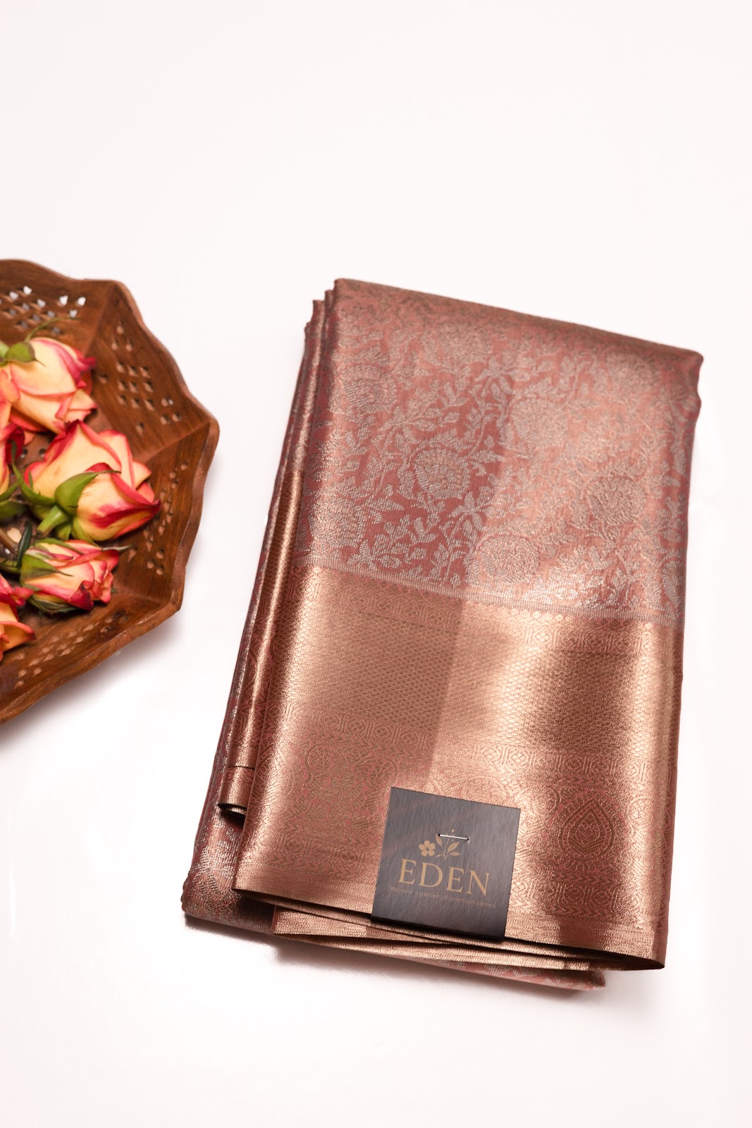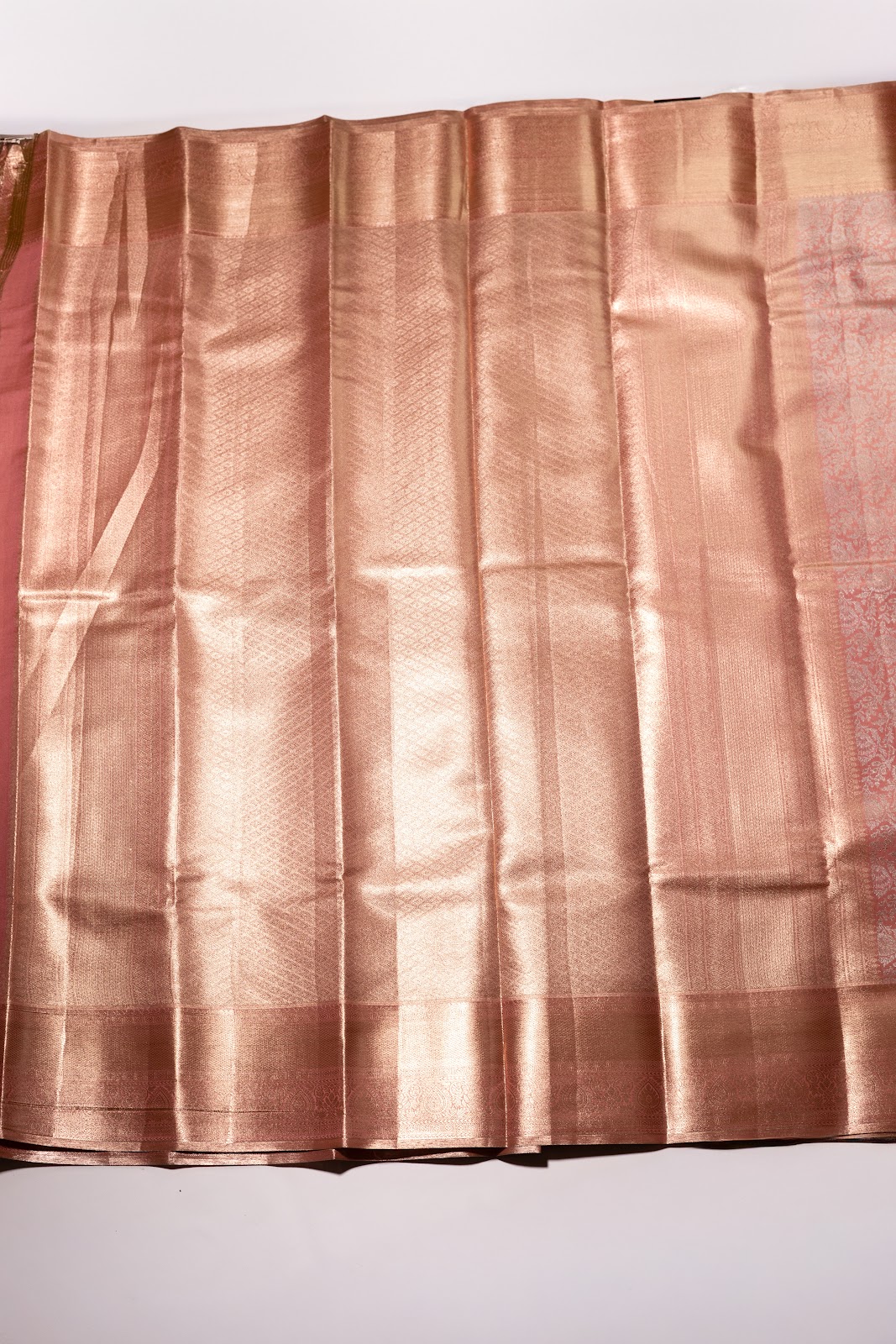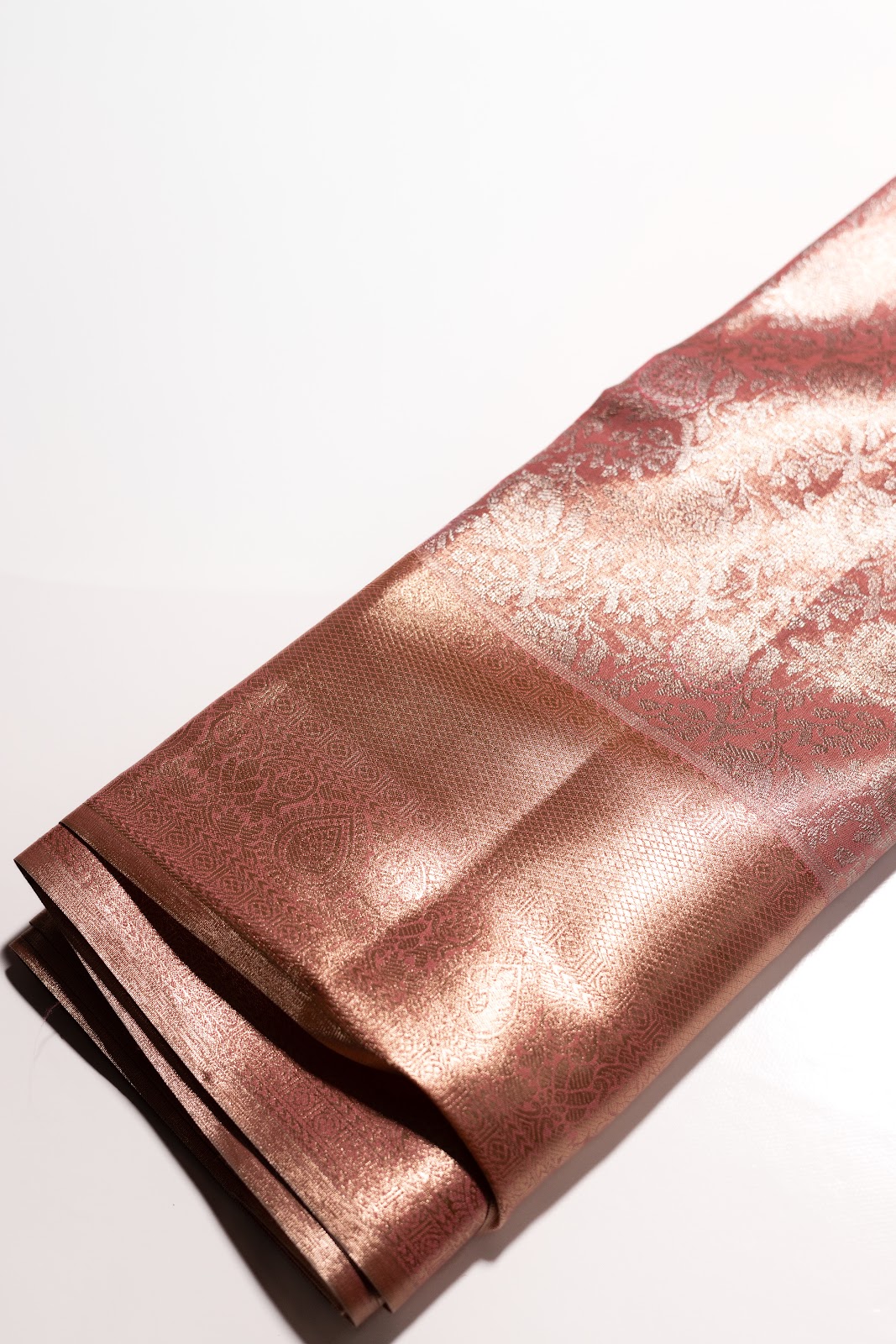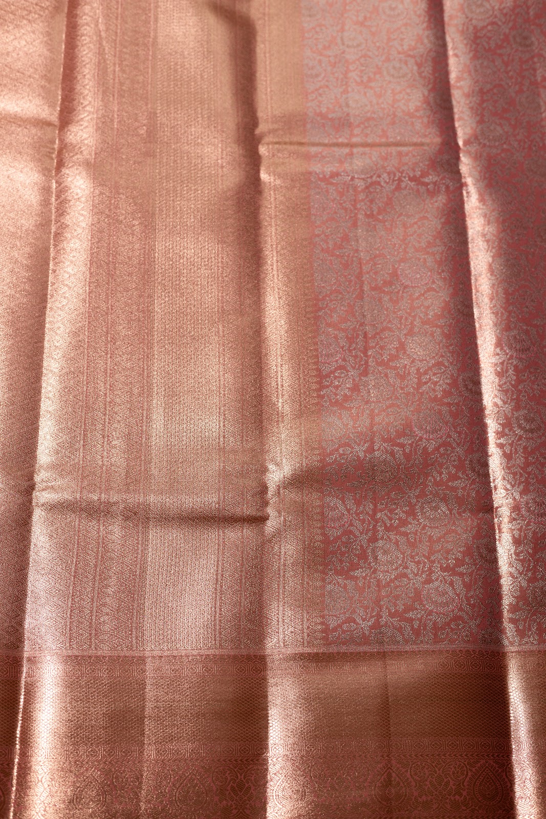 A graceful pastel Kanjeepuram saree in powder pink, woven with delicate all-over floral jaal motifs in soft gold and silver zari. The saree is finished with a refined gold zari border, adding a gentle contrast while maintaining its understated elegance. Paired with brocade blue blouse. Lightweight in feel with a subtle, luminous sheen, this piece is perfect for day weddings, temple visits, and elegant festive occasions.