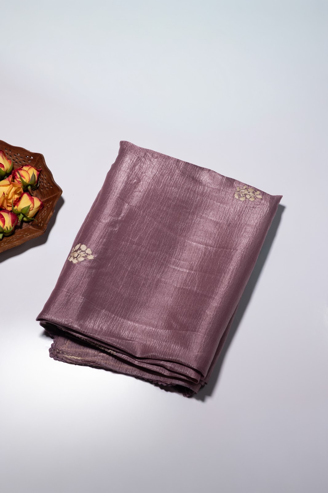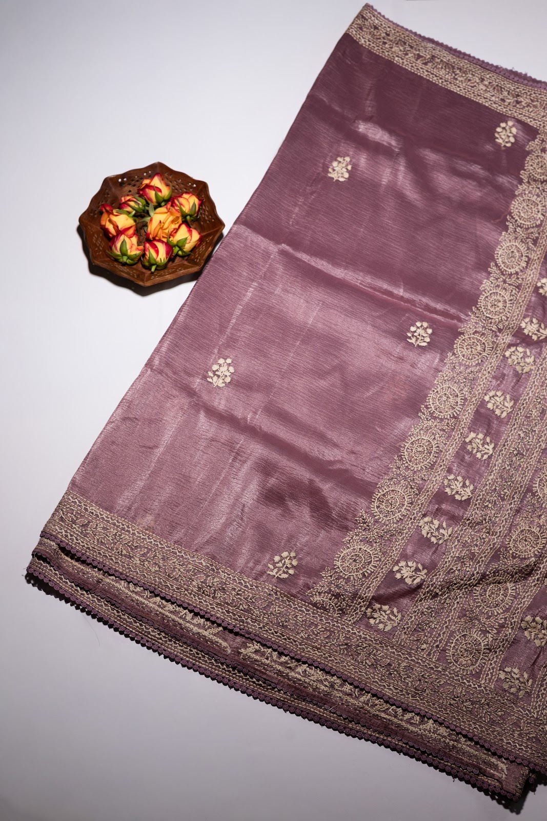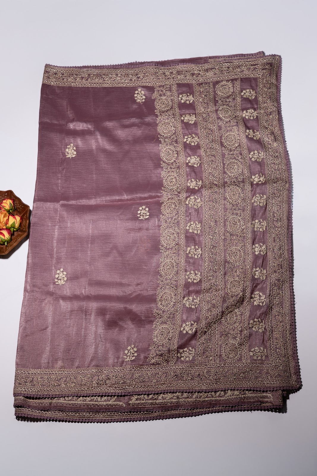 Crushed organza saree featuring subtle floral embroidery across the body and a heavy embroidered pallu with intricate threadwork and detailed borders. Paired with a plain matching blouse finished with a complementary border. Available in onion pink colour. Elegant, lightweight, and perfect for festive occasions.
