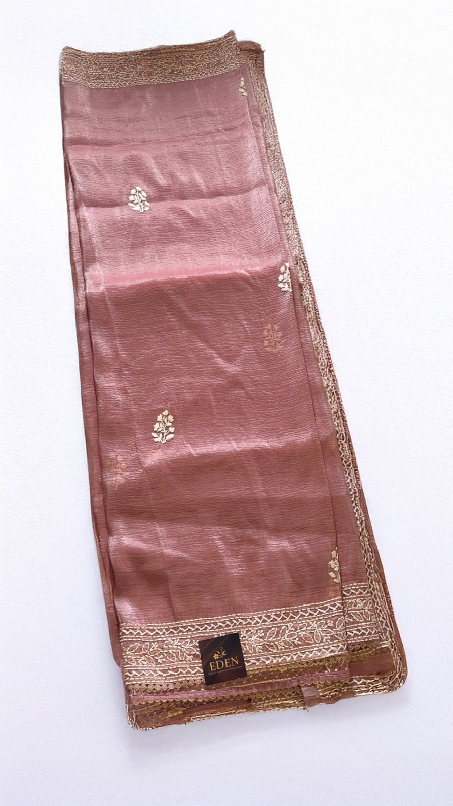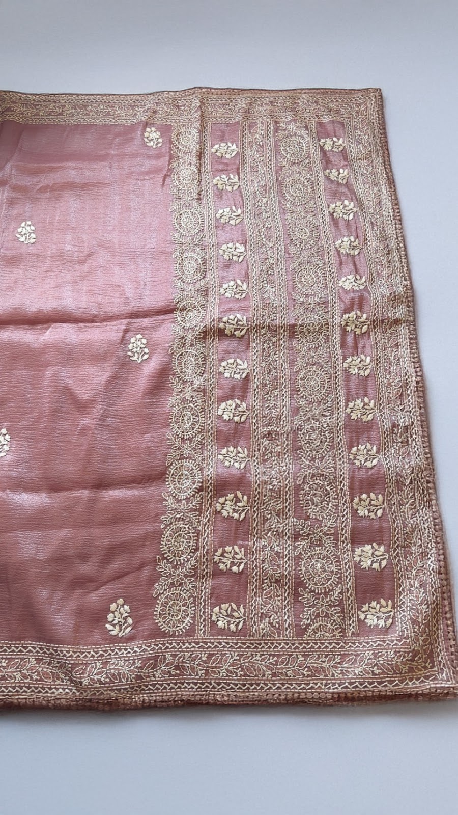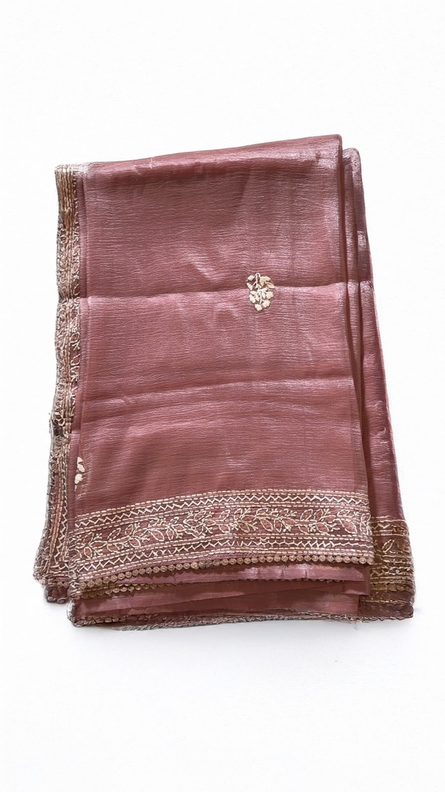 Crushed organza saree featuring subtle floral embroidery across the body and a heavy embroidered pallu with intricate threadwork and detailed borders. Paired with a plain matching blouse finished with a complementary border. Available in Dusty Pink colour. Elegant, lightweight, and perfect for festive occasions.