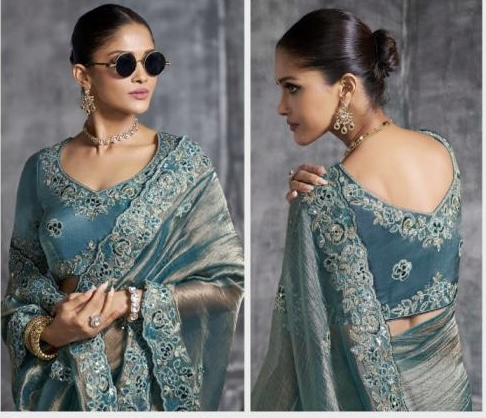Premium Tissue Zari Fabric With resham thread embroidery, intricate floral vines, and crafted motifs. embellishments such as sequins, pearls, mirror work, thread artistry, and hand-finished stonework. Available in colour Sea Green.
