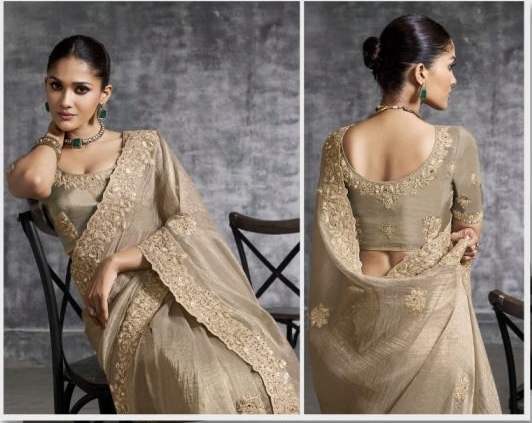 Premium Tissue Zari Fabric With resham thread embroidery, intricate floral vines, and crafted motifs. embellishments such as sequins, pearls, mirror work, thread artistry, and hand-finished stonework. Available in colour Champagne Gold.