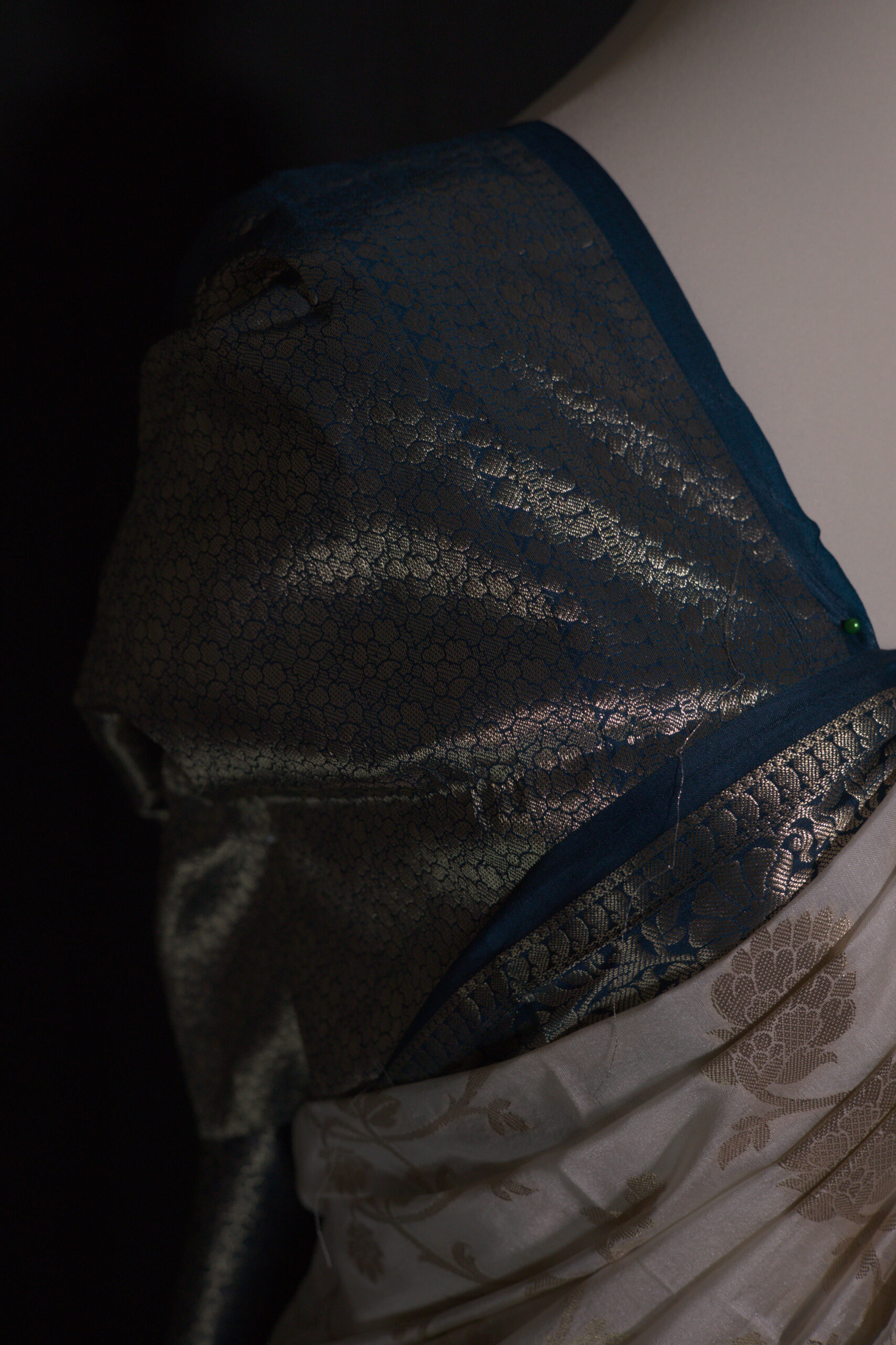 A vintage Kanjipuram silk saree in a soft ivory base, beautifully adorned with delicate floral motifs woven in gold zari throughout the body. Finished with a rich contrast maroon banarasi-style border, this saree reflects timeless craftsmanship and heritage charm. Subtle, graceful, and luminous, it is a classic piece perfect for weddings, festive occasions, and traditional celebrations.