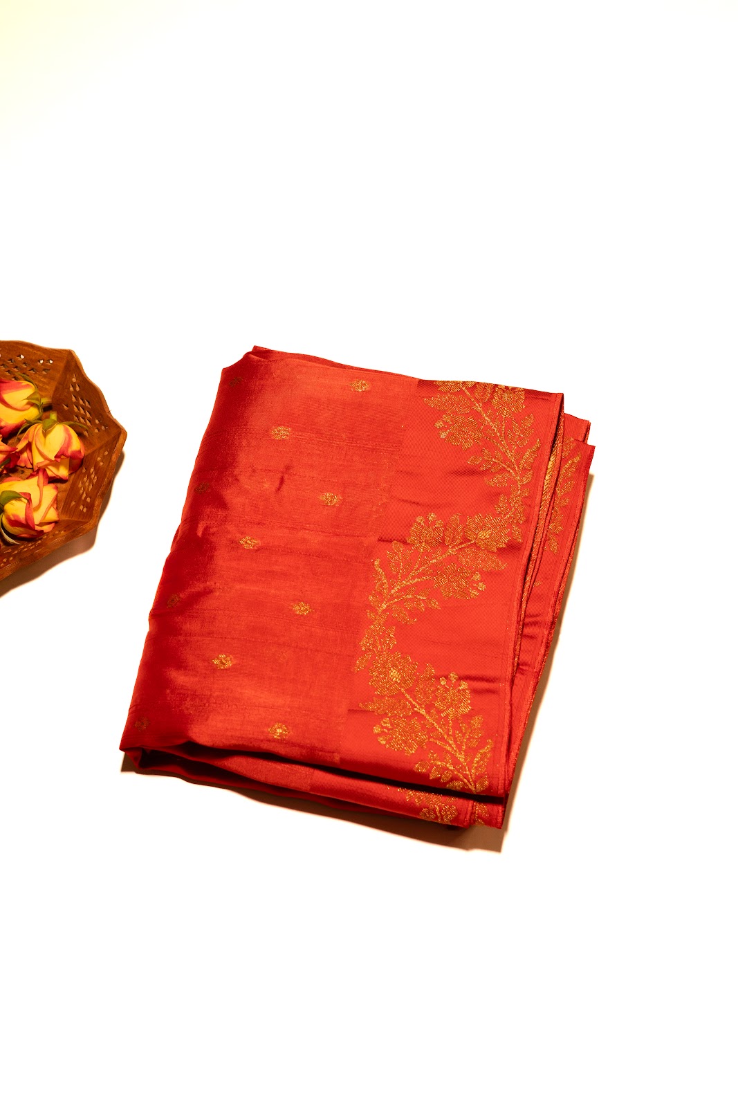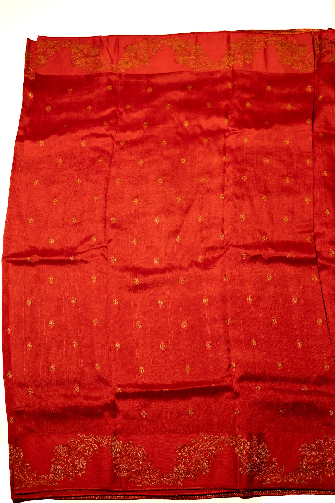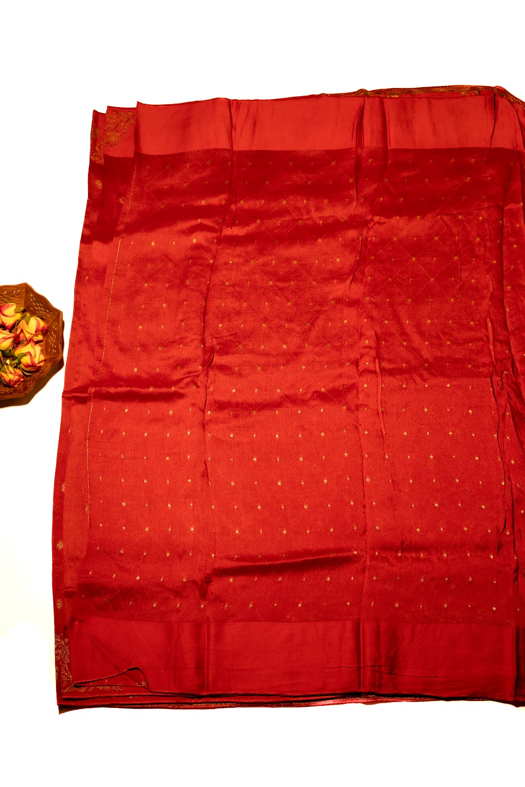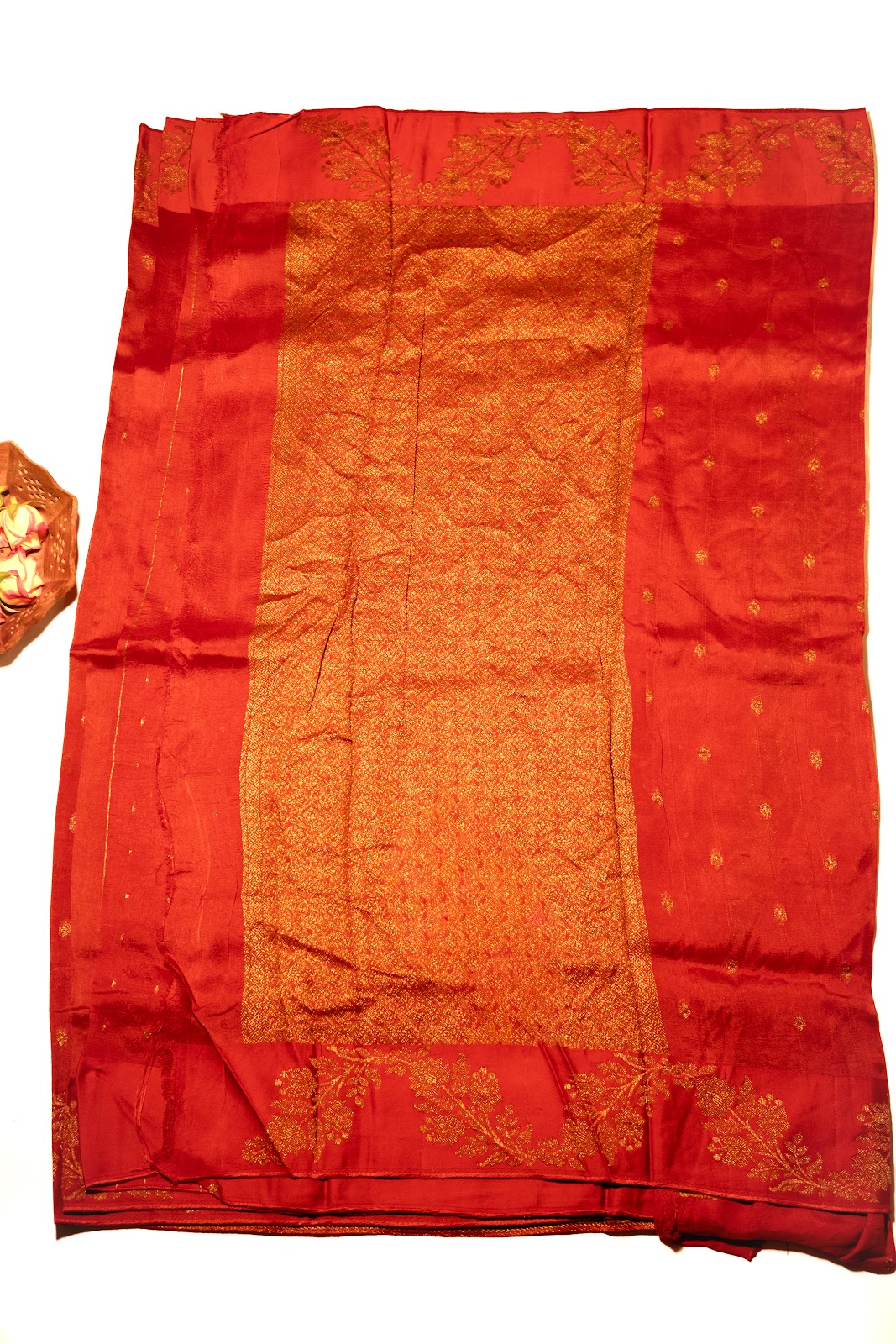 A rich red jute banarasi saree adorned with subtle gold butti motifs across the body. The grand pallu features a luxurious gold zari weave with intricate traditional patterns, perfectly balanced by an ornate border. Finished with a matching red blouse highlighted with heavy gold detailing, this saree captures festive elegance—ideal for evening gatherings.