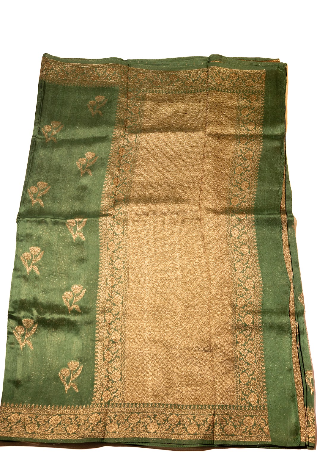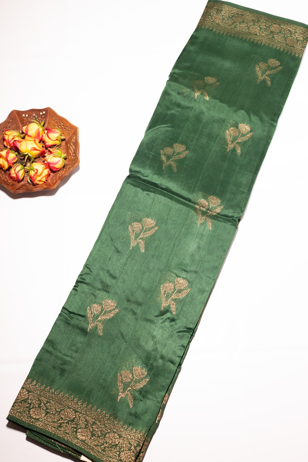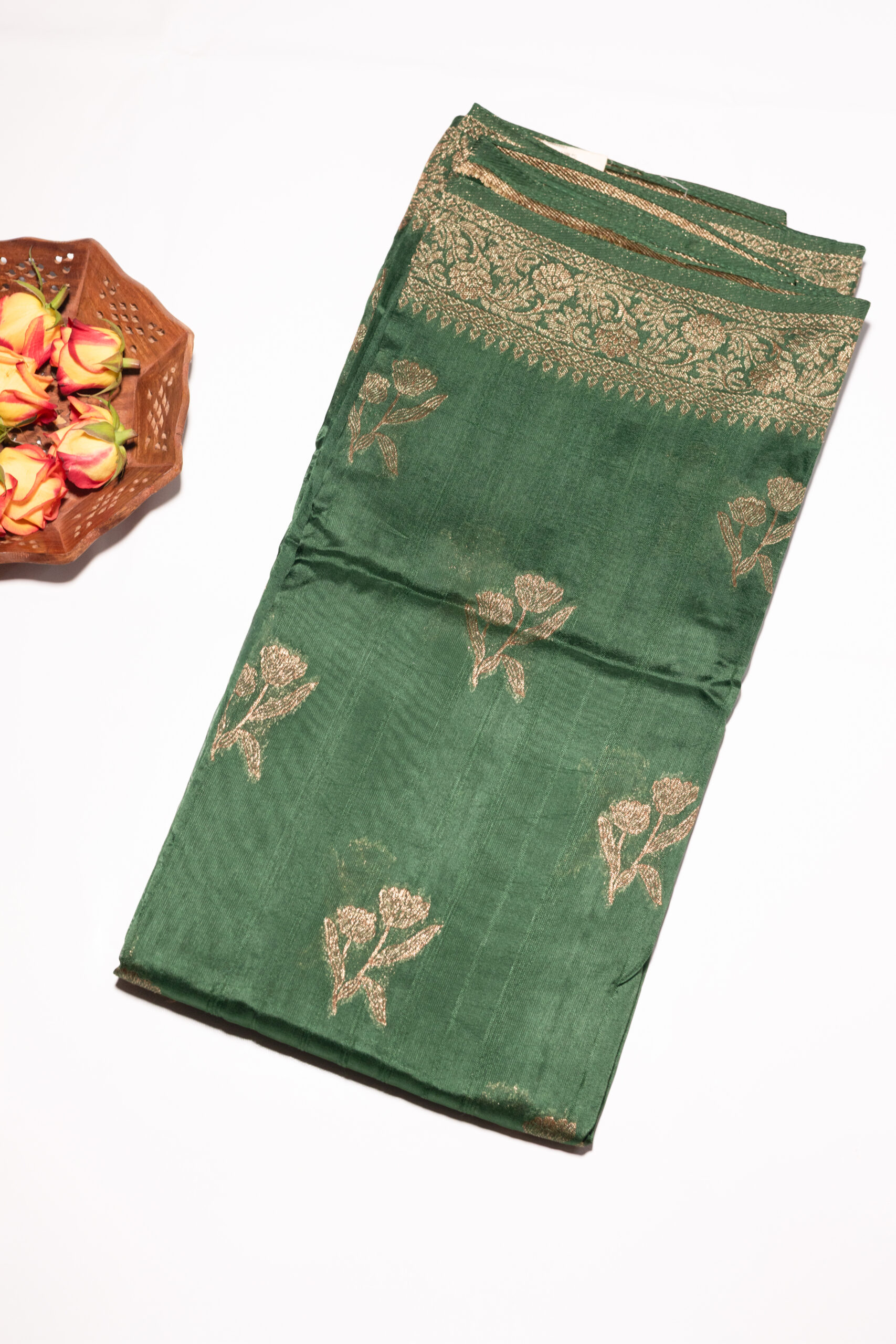 A rich bottle green jute banarasi saree featuring a traditional border woven with elegant copper zari and delicate floral motifs. The classic green-and-gold palette captures the warmth of the Christmas season.