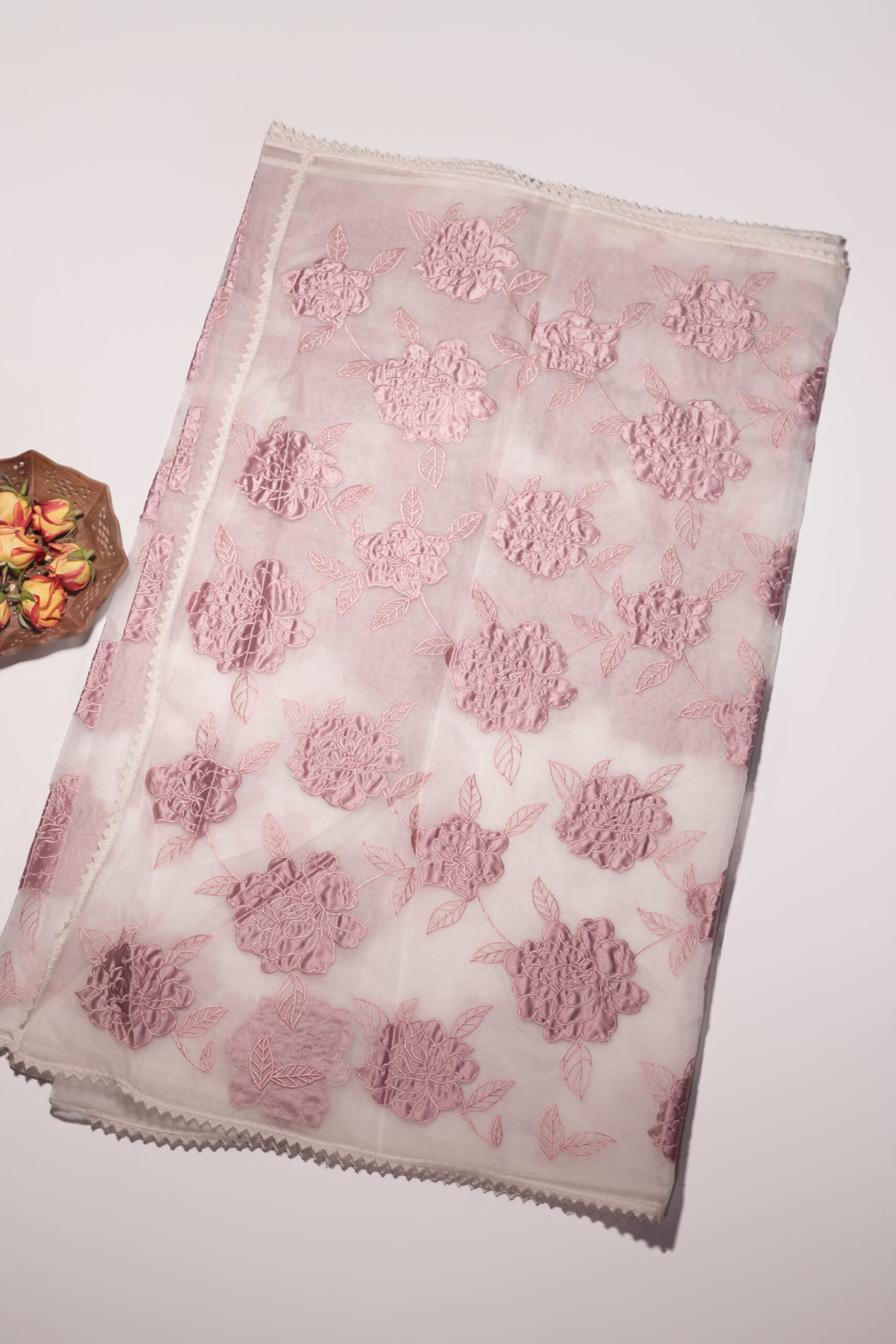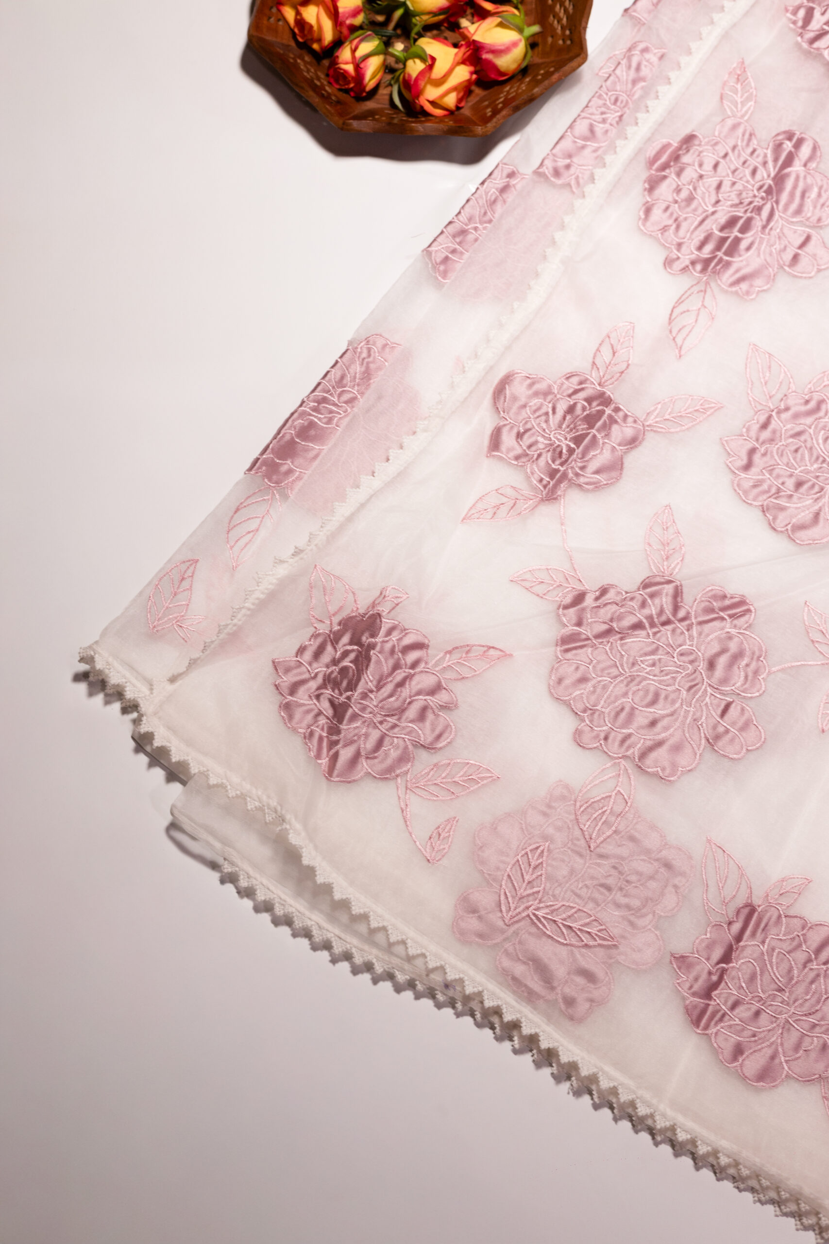 Turkish organza saree in a soft white base, adorned with elegant powder-pink satin floral appliqué and delicate thread-embroidered leaf motifs. Finished with a scalloped lace border for a graceful, feminine touch.