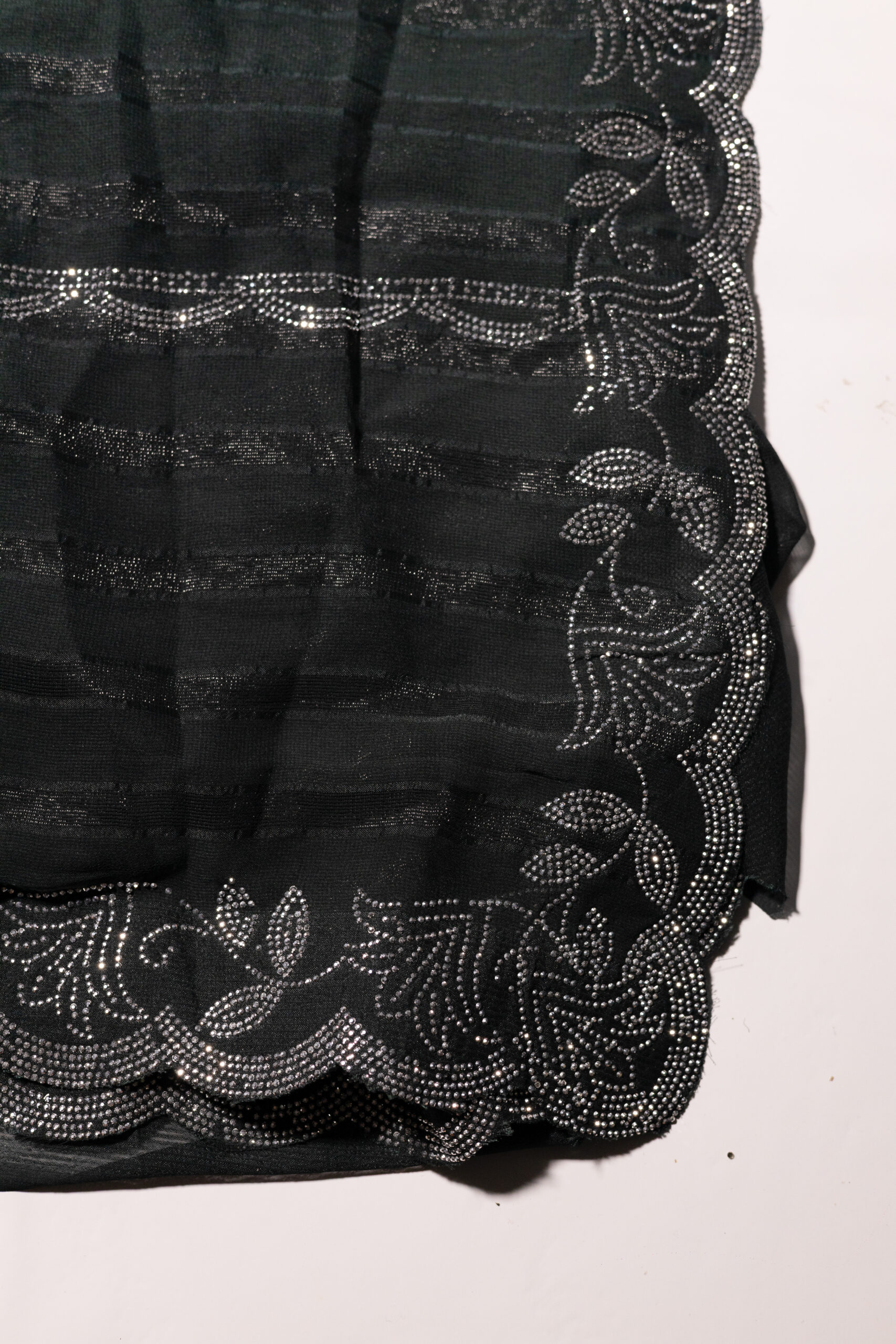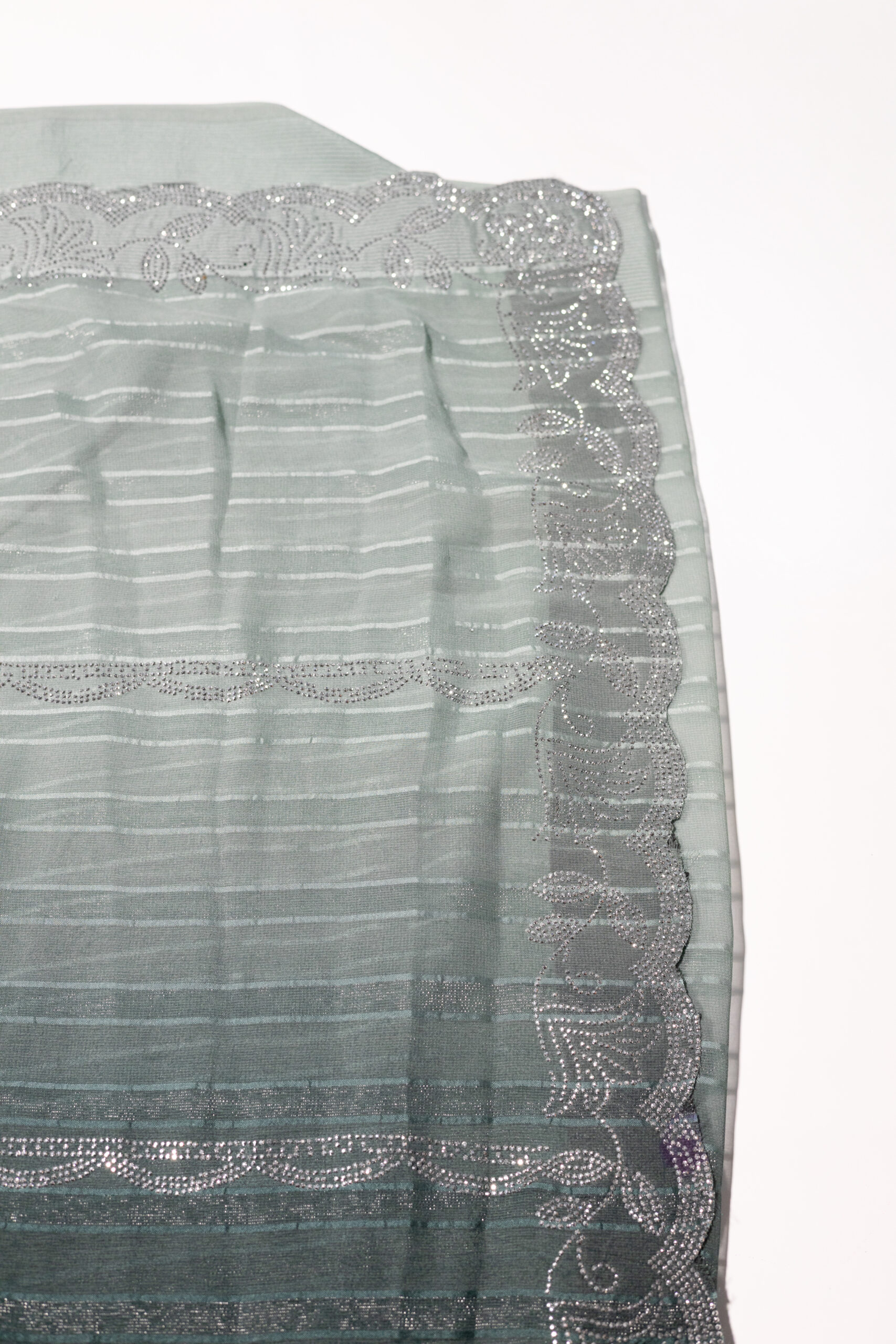 Ombré semi-georgette saree blending soft dusty blue into deeper midnight blue tones. Adorned with delicate stonework across the body and finished with a scalloped, stone-embellished border for an elegant, contemporary drape.