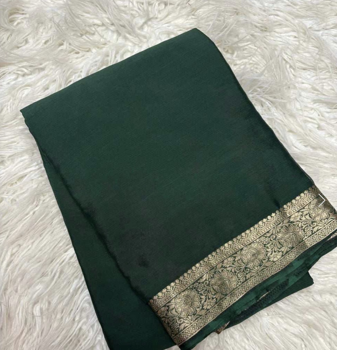 A luxurious party-wear silk saree crafted from premium nylon fabric, featuring exquisite pure metallic gold zari border as a the statement. Easy to drape and comfortable to wear, this saree stays perfectly in place with a graceful fall. This piece is available in three striking shades— forest green.