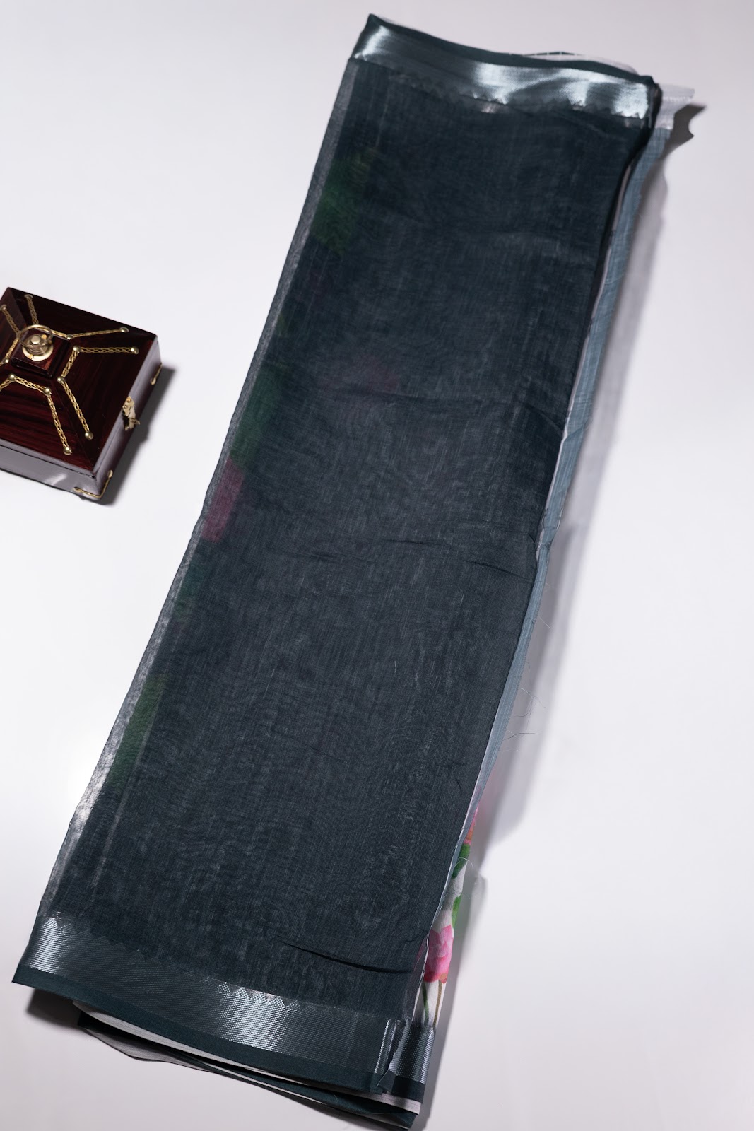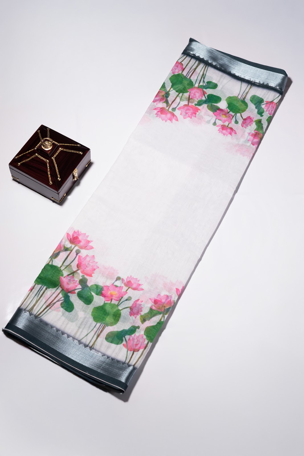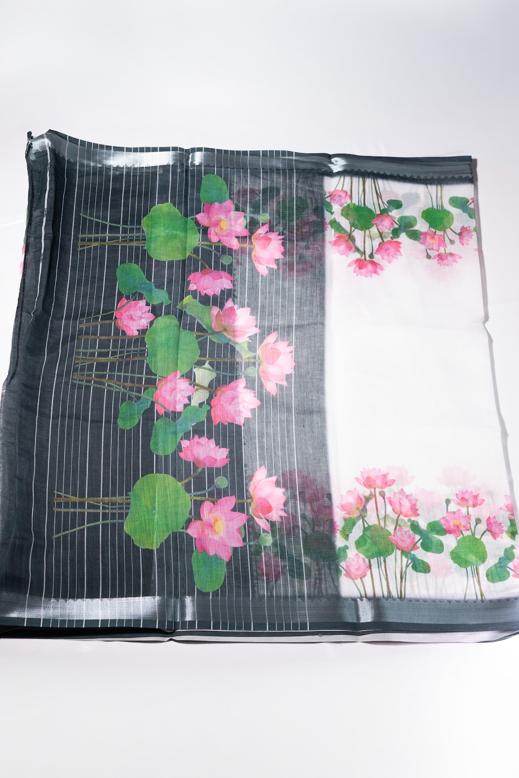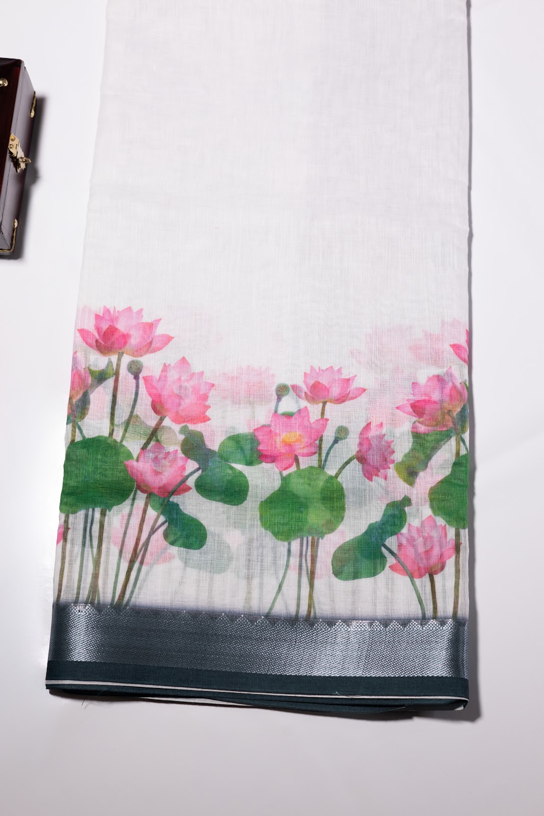 A linen cotton saree featuring lotus floral prints on both ends, set on a soft, breathable base. Finished with a dark green border highlighted with silver zari, it is paired with a dark green blouse with white vertical stripes.