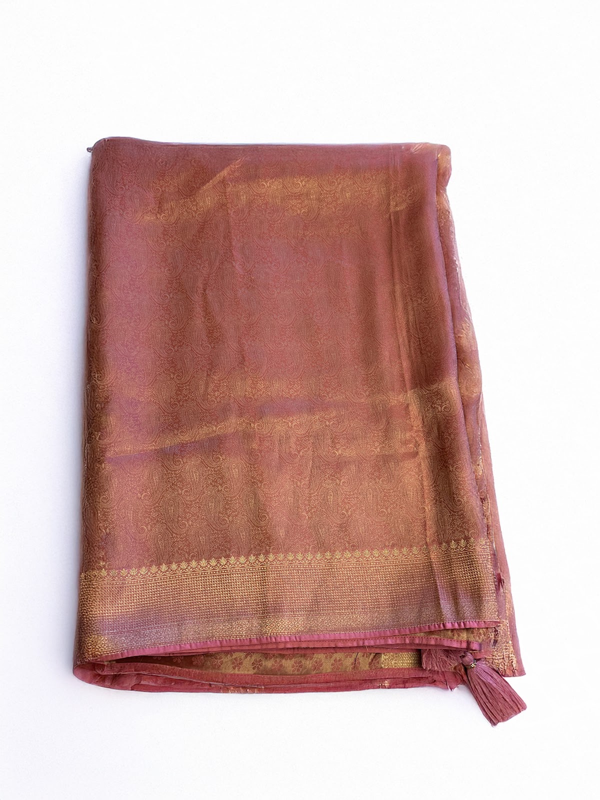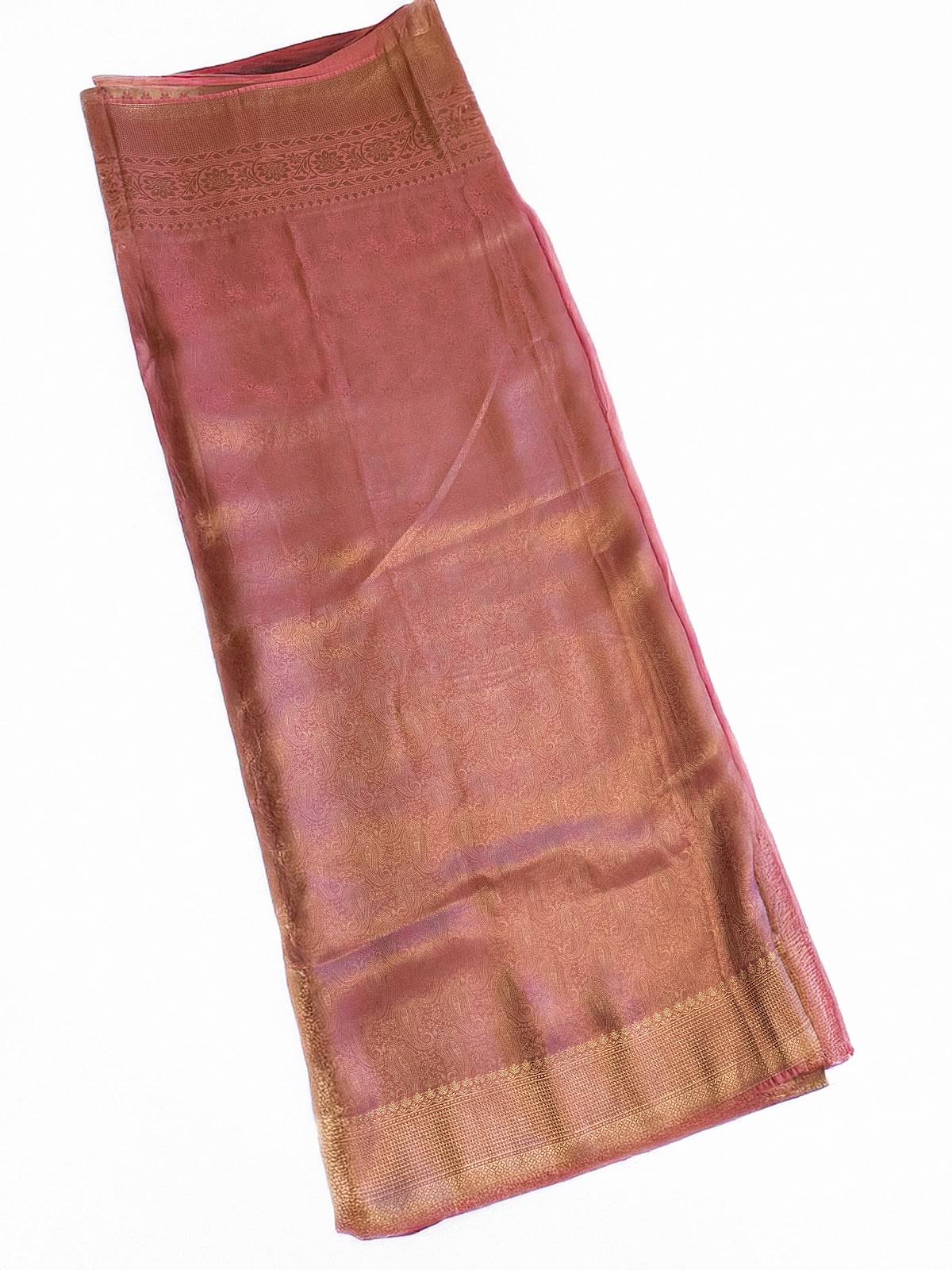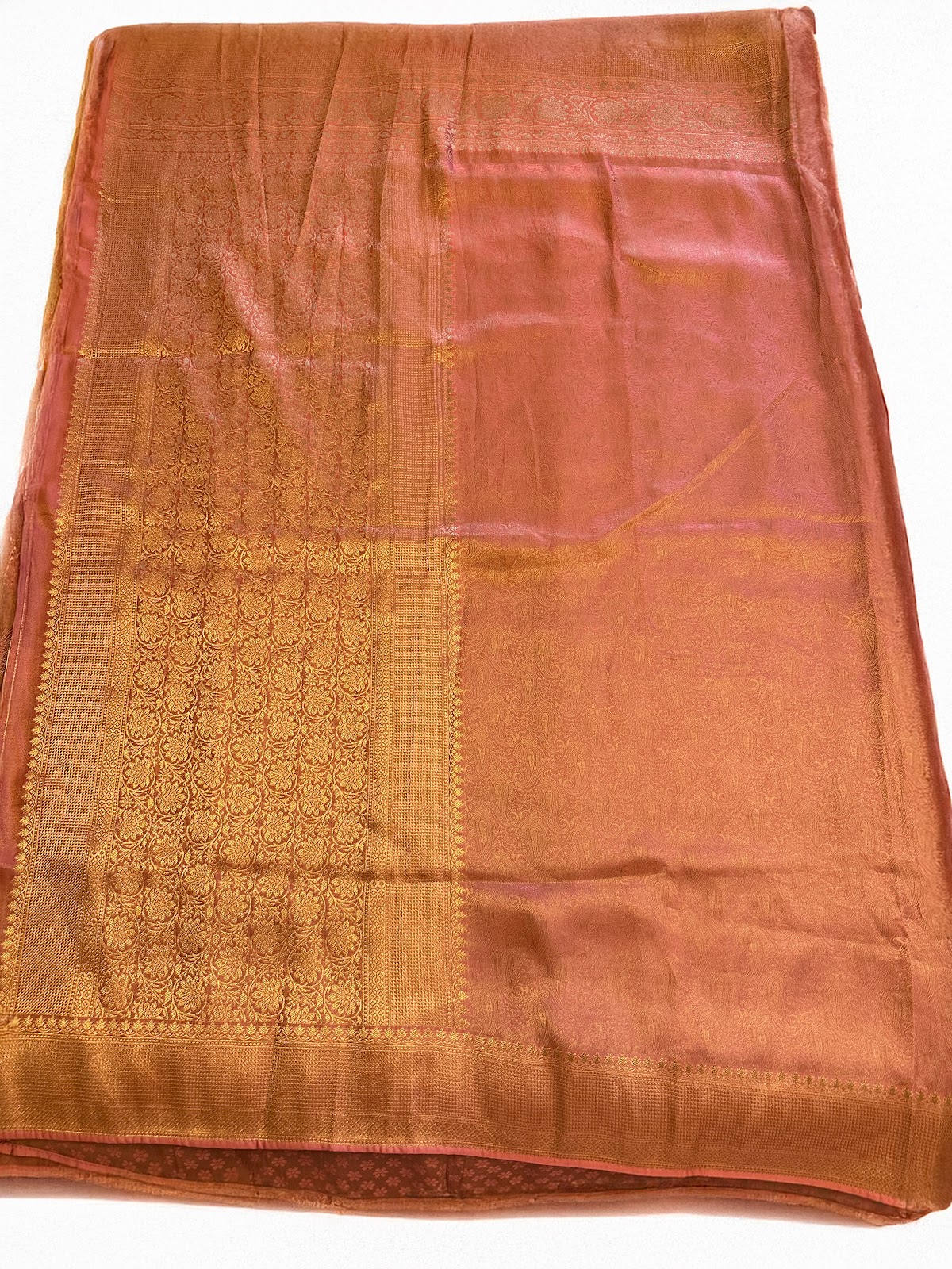 A Kanjeepuram crepe Banarasi saree in a warm peach-gold tone, designed for an easy and comfortable drape. Finished with a rich gold zari pallu and a refined border. Paired with a matching gold blouse featuring small peach floral buttas.