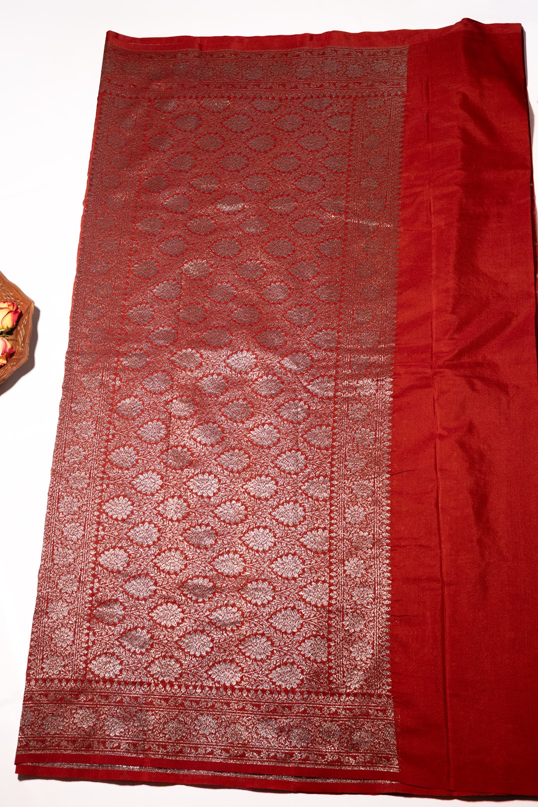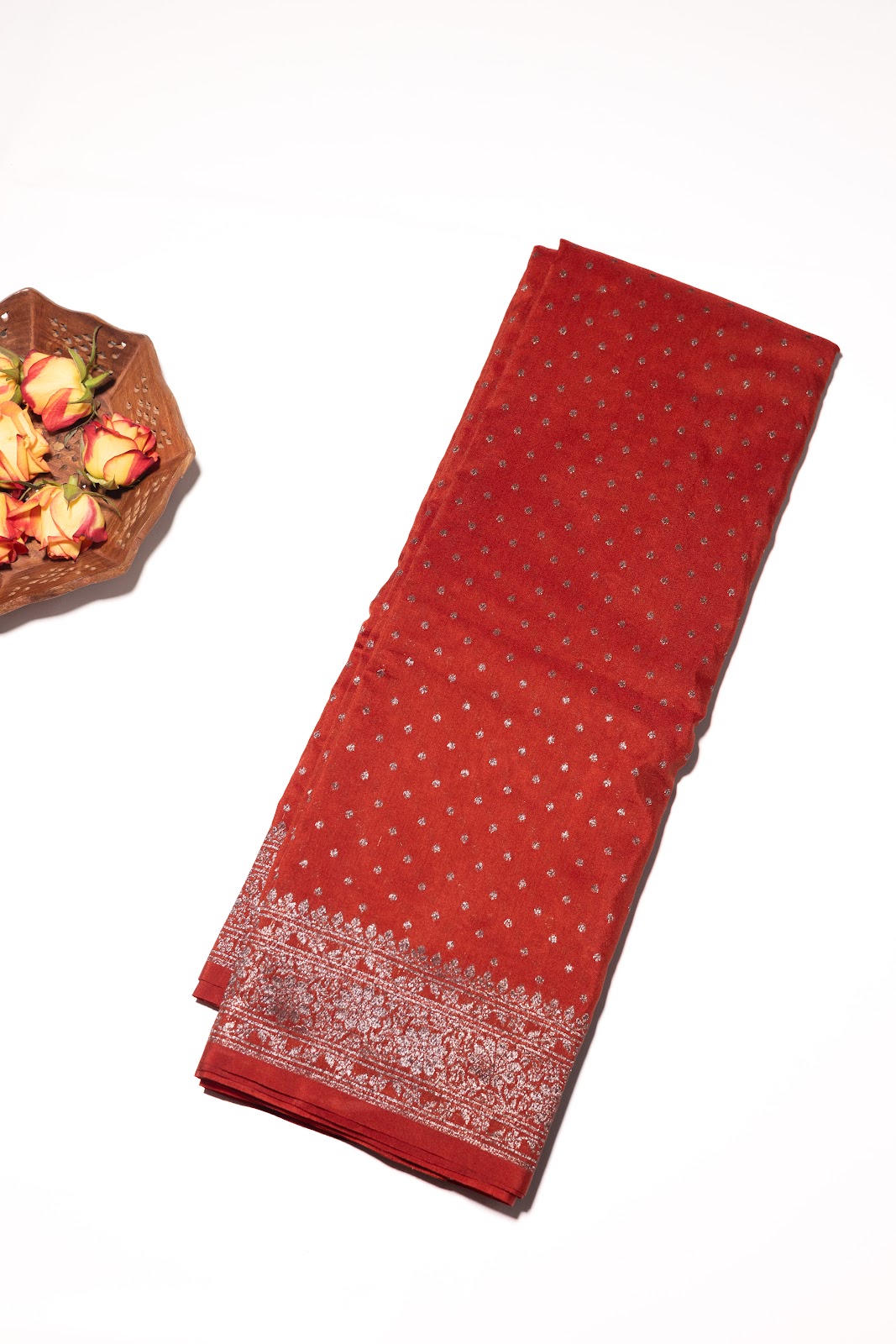 Rich red Banarasi saree woven with fine metallic zari. The body features delicate small buttas, complemented by a traditional handcrafted border. A timeless classic, perfect for festive and bridal occasions.