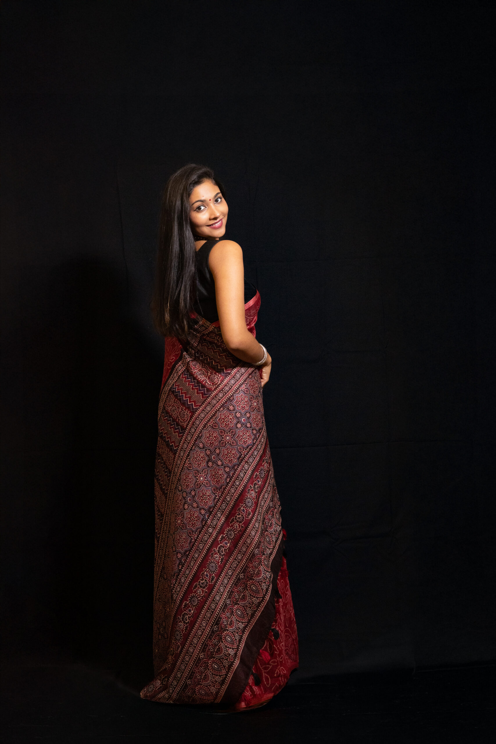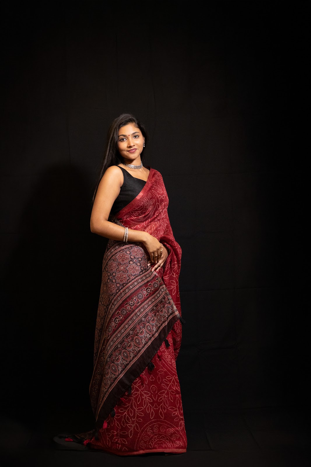 A soft modal saree featuring intricate geometric and floral prints across the body in rich maroon and black tones. Finished with a bold horizontal printed pallu with tassel detailing and paired with a contrasting printed blouse piece. Lightweight, breathable, and fluid in drape.