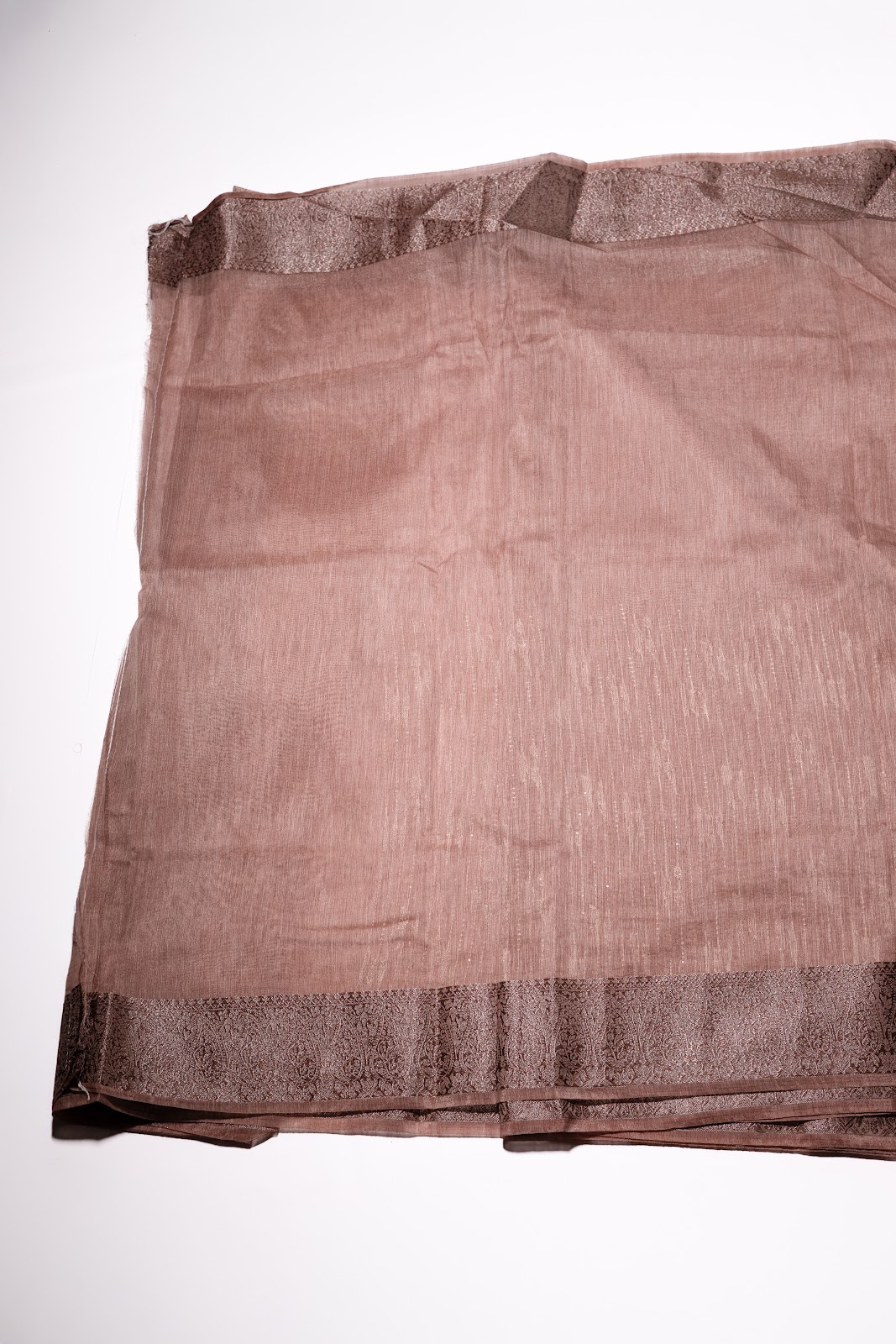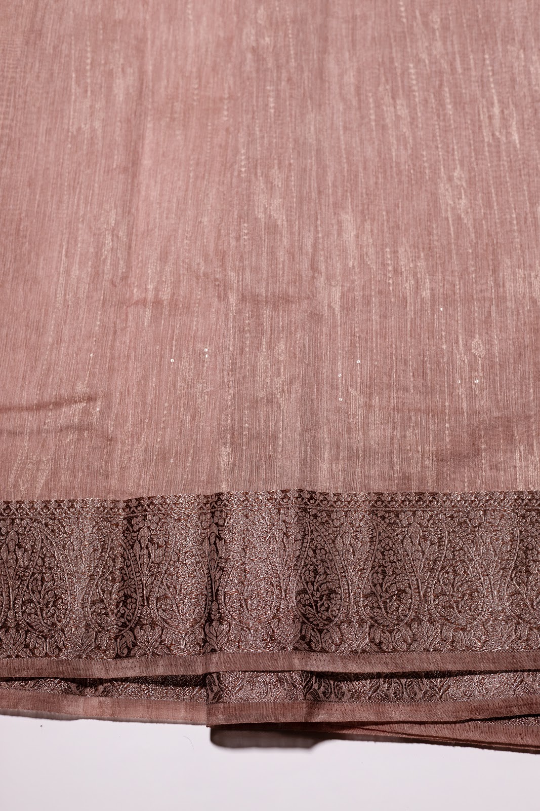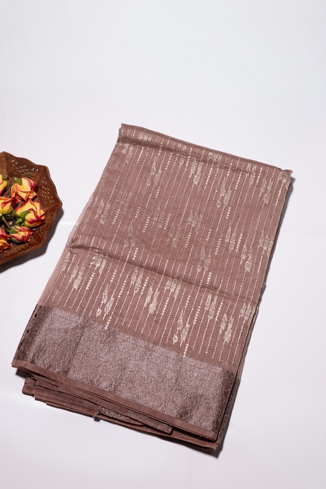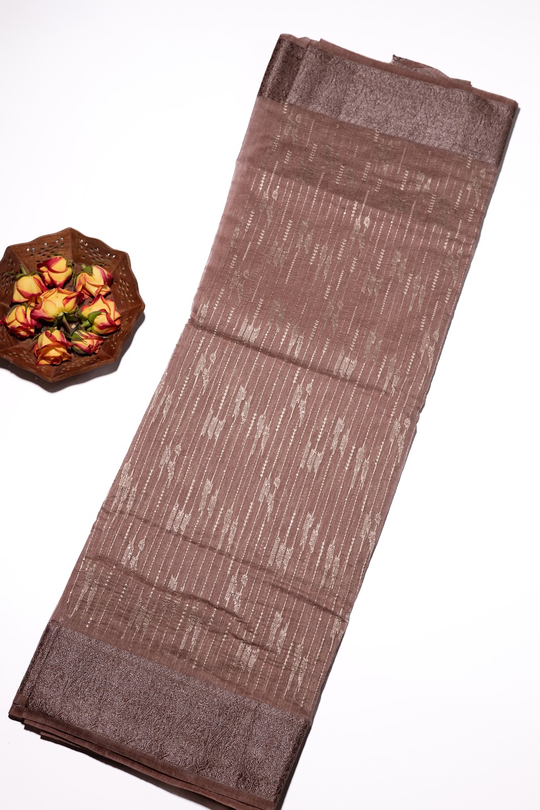 A semi jute saree in a rich earthy brown tone, detailed with linear threadwork running throughout the body for a subtle textured finish. Accented with an elegant Banarasi border that adds depth and heritage charm. Paired with a simple matching blouse.